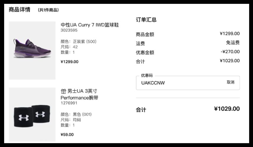 而且目前正值 UA 官网「女王节」活动,付款时输入券码 UAKCCNW 可享受满 500 减 50,满 700 减 100,满 1000 减 150 的「满减再满减」活动!到手仅需¥1029 RMB!