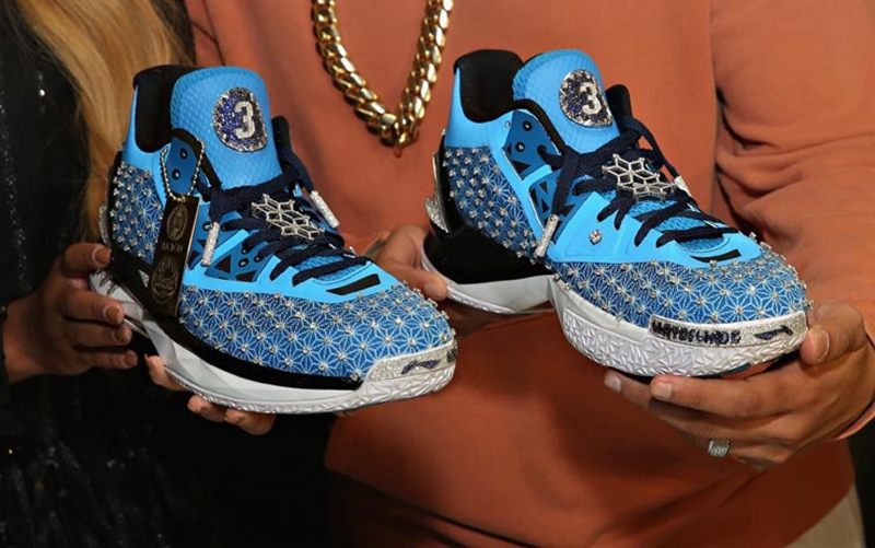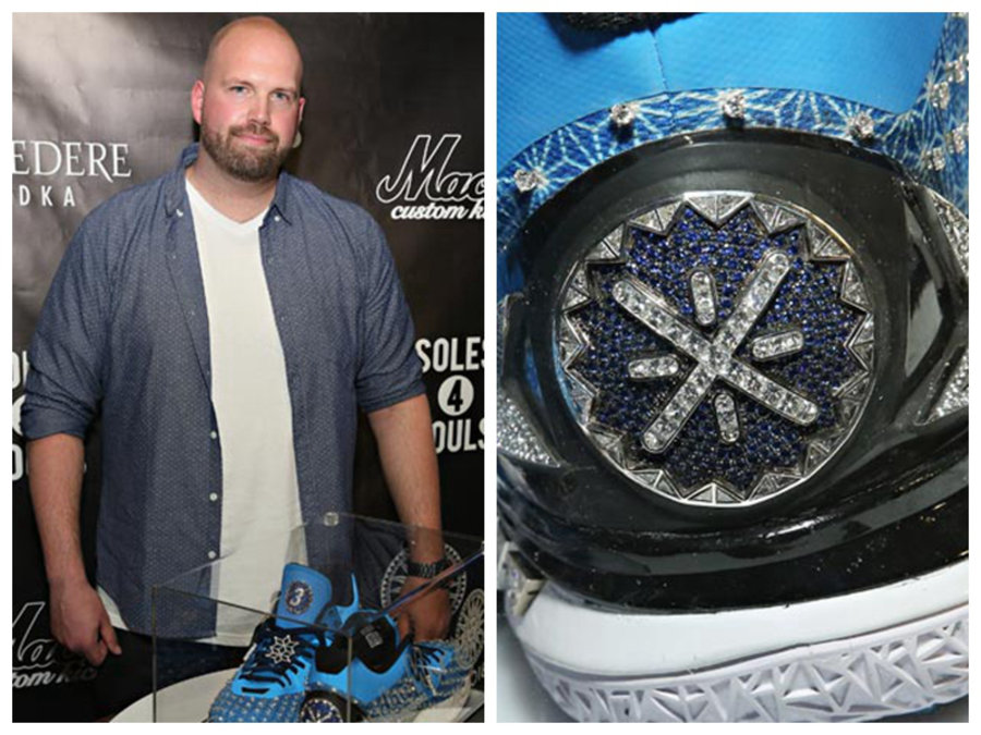 这双鞋由纽约生活品牌 Bicion 与美国球鞋定制大师 Mache 共同打造,鞋面、鞋舌以及后跟镶满钻石珠宝,并配有一块纯金吊牌。