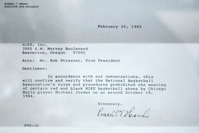 早年前 NBA 执行副总裁 Russ Granik 写给 Nike 副总裁 Rob Strasser 的信中,曾提到 1984 年 10 月 18 号,Michael Jordan 因穿了一双 “黑色和红色” 的 Nike 篮球鞋因而触犯了联盟对球服球鞋的规则。