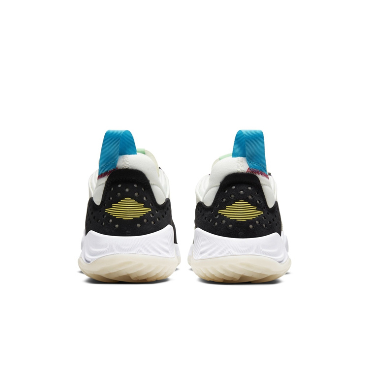 后跟以黄色呈现飞翼 Logo,黑色底色下格外亮眼。最后辅以白色中底以及生胶色外底完善整双鞋的设计。