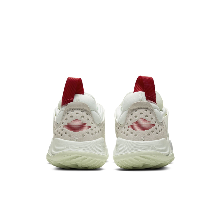 后跟同样带有红色鞋提以及线条勾勒出的飞翼 Logo,搭配微微带有绿色的 React 中底以及外底,完善整双鞋的设计。