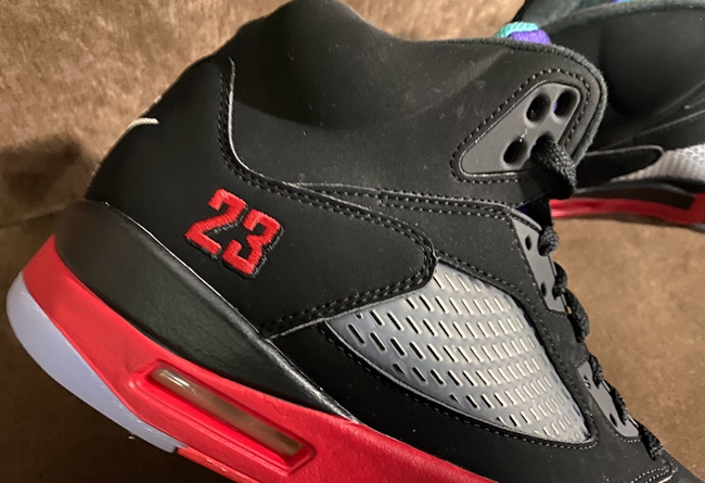 不同于最早曝光的效果图,整双鞋并非采用鸳鸯配色呈现,而只是将 Air Jordan 5 中经典的「黑银」、「白红」和「葡萄」三大经典配色融为一体。