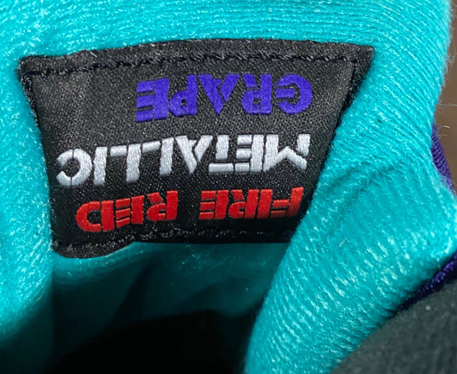 鞋舌内部细节,以倒置字样呈现 Fire Red、Metallic、Grape 三个灵感来源的配色名,点明鞋款主题。