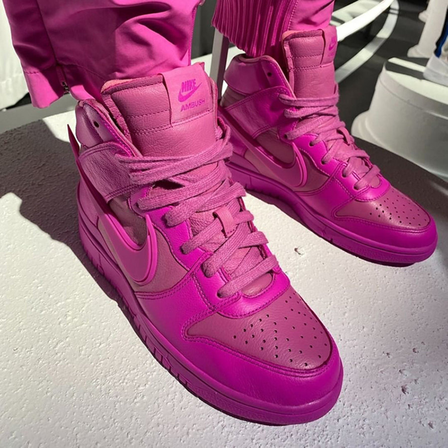 近年来迅速走红的时尚品牌 AMBUSH 也将在今年带来全新 Nike 联名鞋,鞋型选择上采用热度极高的 Dunk High 鞋型!一袭粉红色装扮带来极为亮眼的视觉效果,鞋面材质选用质感十足的荔枝皮材质打造,运用不同深浅的粉红色,巧妙勾勒展现出鞋身层次感。