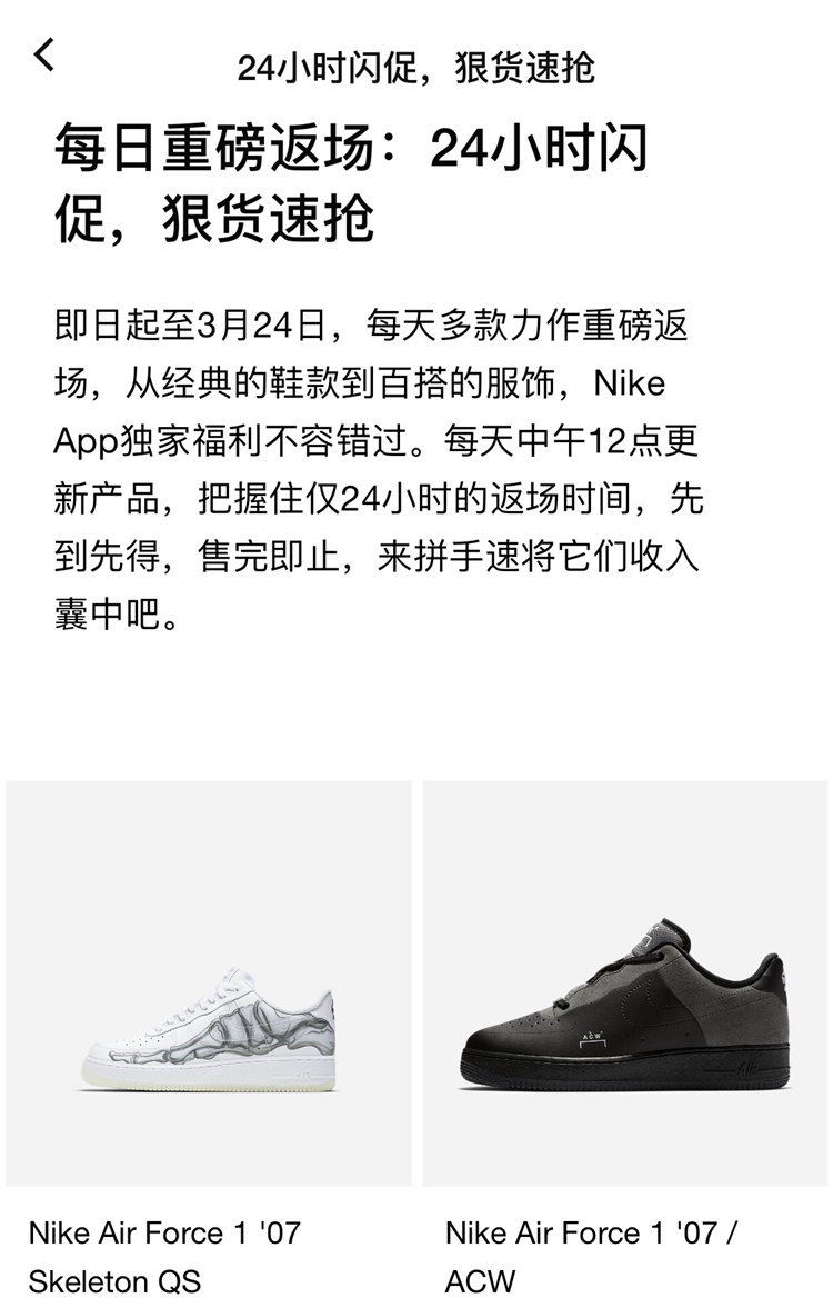 具体活动内容一定要看仔细!自 3 月 10 日起至 3 月 24 日上午 11:59,每天中午 12 点 Nike APP 都将带来重磅鞋款以及服饰的返场发售!