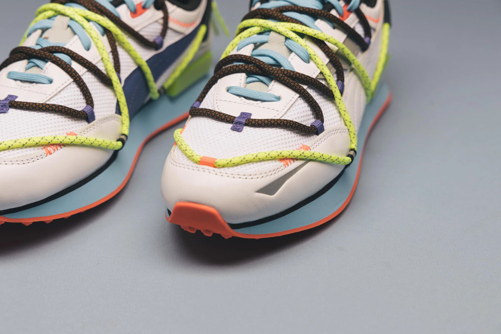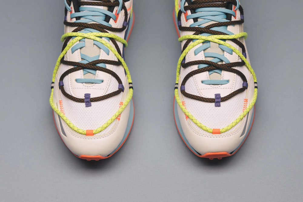 系列以日益紧张的水资源短缺为主题,设计上加入解构手法重塑的三重鞋带系统,与 OFF-WHITE x Nike Waffle Racer 颇为相似。