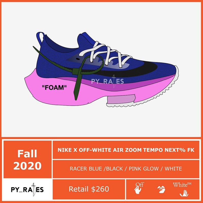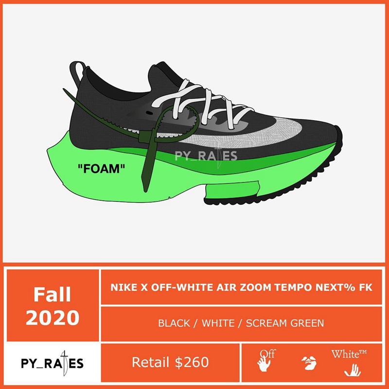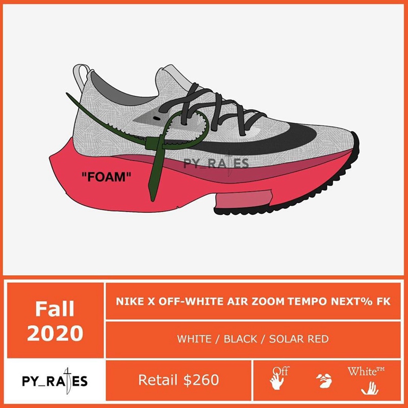 近日球鞋账号 PY_RATES 曝料,其中一款 Air Zoom Tempo Next% FK 将迎来与 OFF-WHITE 的重磅联名,将原本关注度极高的新品,赋予更具话题性的联名光环!