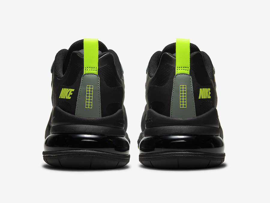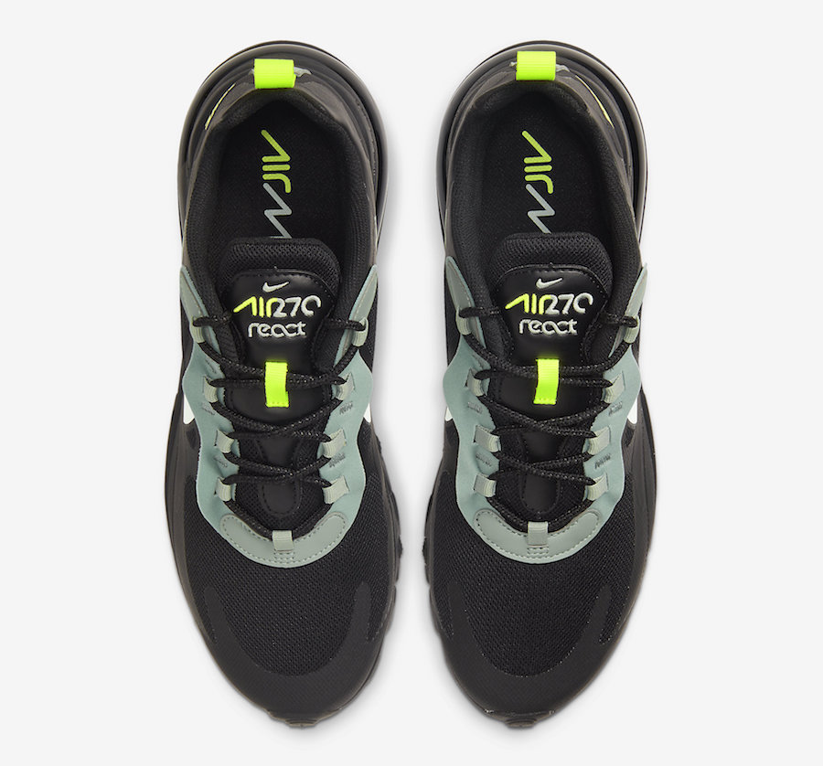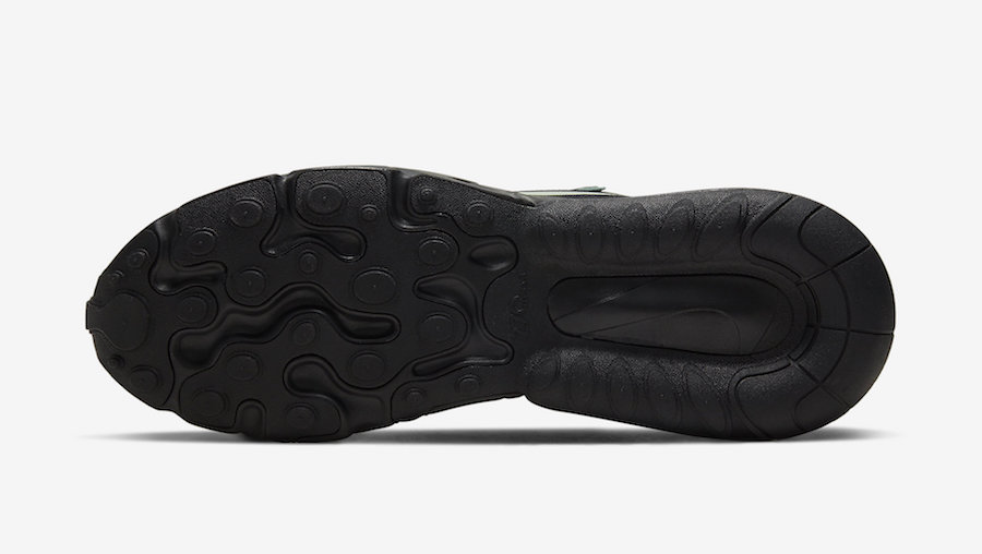 延续 Air Max 270 React 的经典造型,多材质拼接打造的黑色鞋身,搭配不同饱和度的绿色点缀,颇有小丑配色的既视感!