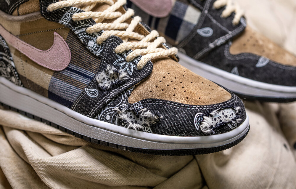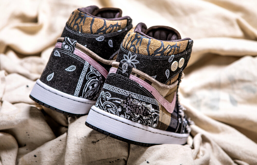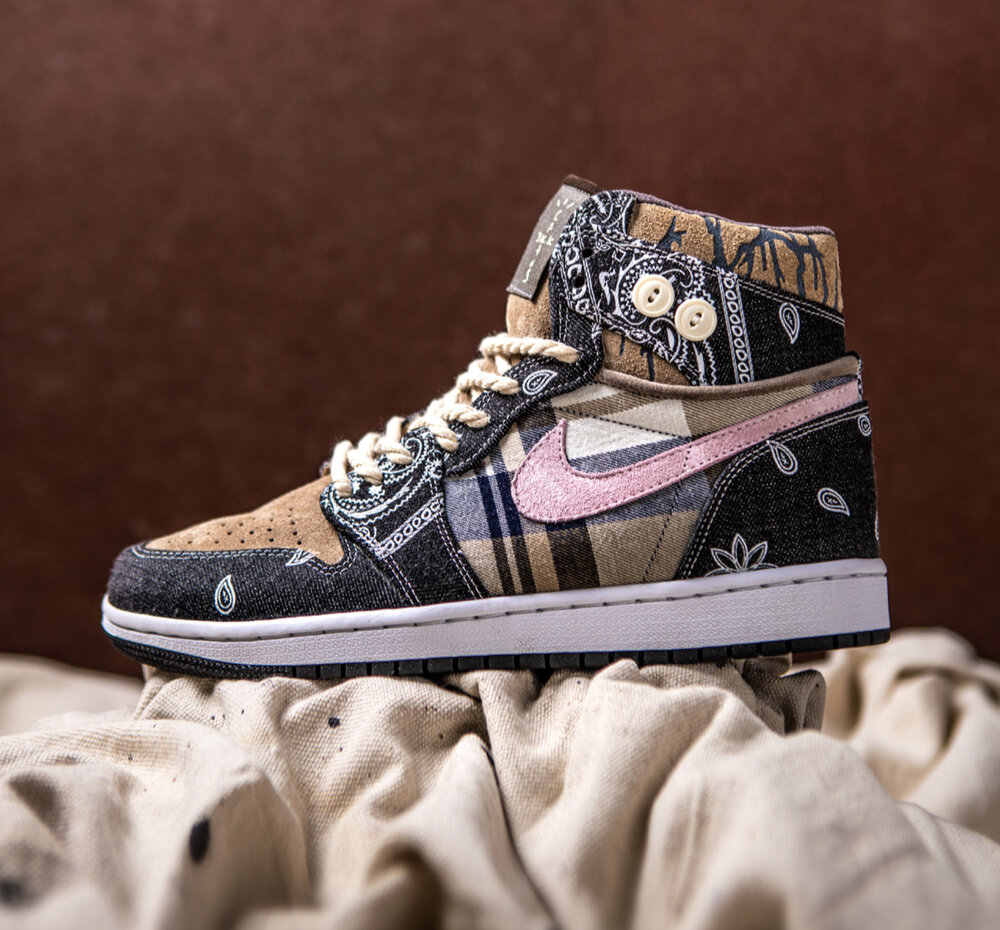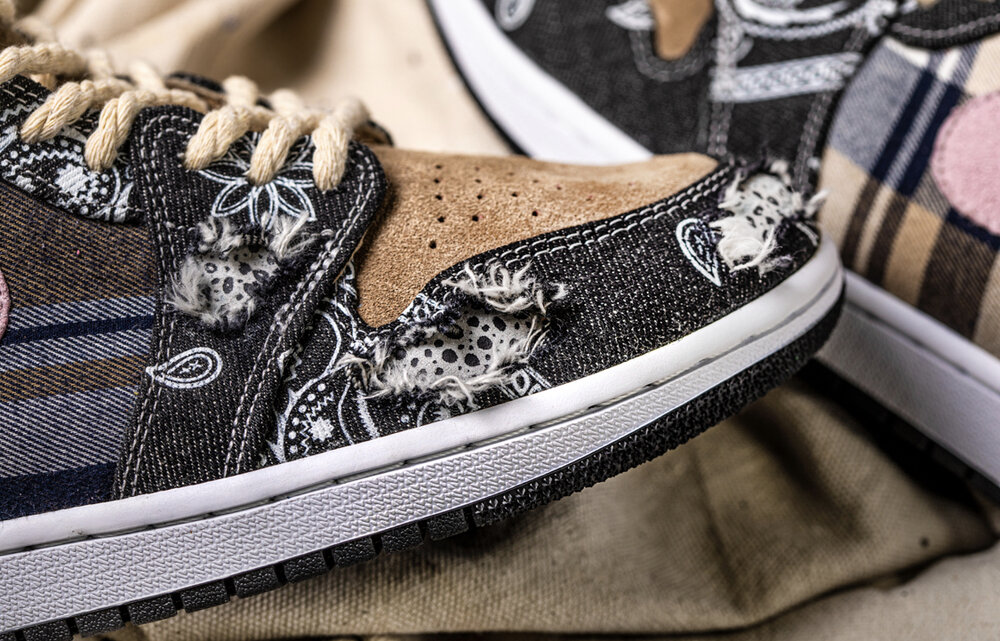 近日 Travis Scott x Nike Dunk SB Low 刚刚登场,BespokeIND 便以这双鞋的鞋面主题风格,打造了一双特别的 Air Jordan 1 “Bandana”定制鞋款。