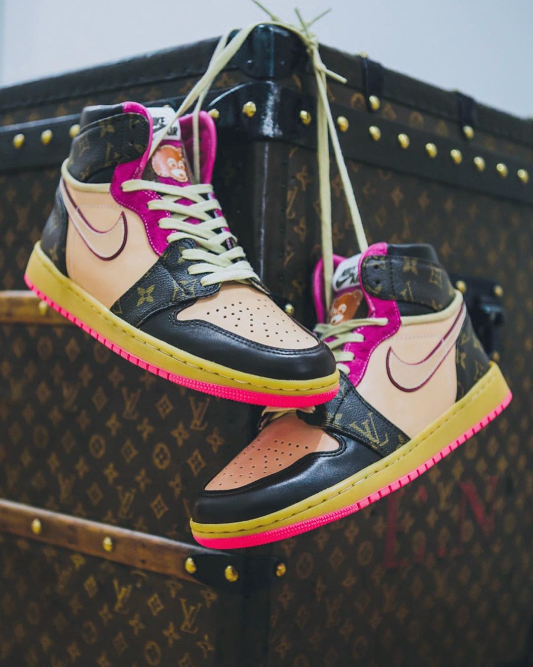 这双鞋以 9 孔的 Air Jordan 1 为蓝本,选以 Travis Scott 联名相同质感的材料以及配色风格呈现。