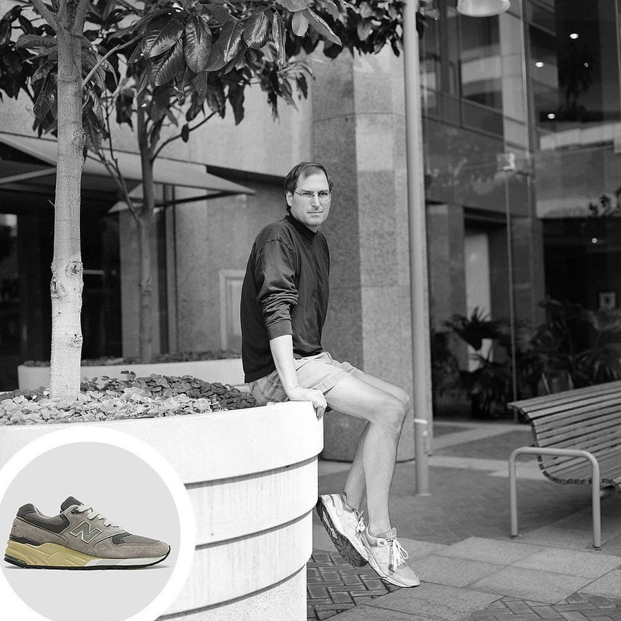 在网上你能找到乔布斯在人生各个时期上脚 New Balance 的照片,其中就能看到 990、999 这样的经典鞋款,还都是最有代表性的元祖灰配色。