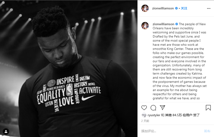 值得一提的是,由于新冠肺炎影响,NBA 2019 - 2020 赛季余下比赛将无限期停摆,不少球员挺身而出。其中来自新奥尔良鹈鹕队的「胖虎」锡安·威廉姆斯通过个人社交账号宣布他将支付未来 30 天新奥尔良鹈鹕队主场球馆(New Orleans Pelicans)所有员工的薪水。