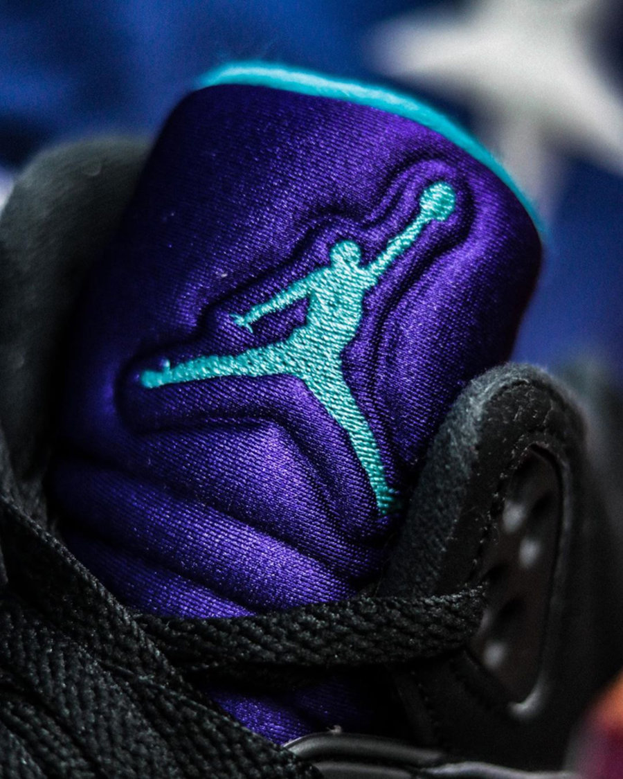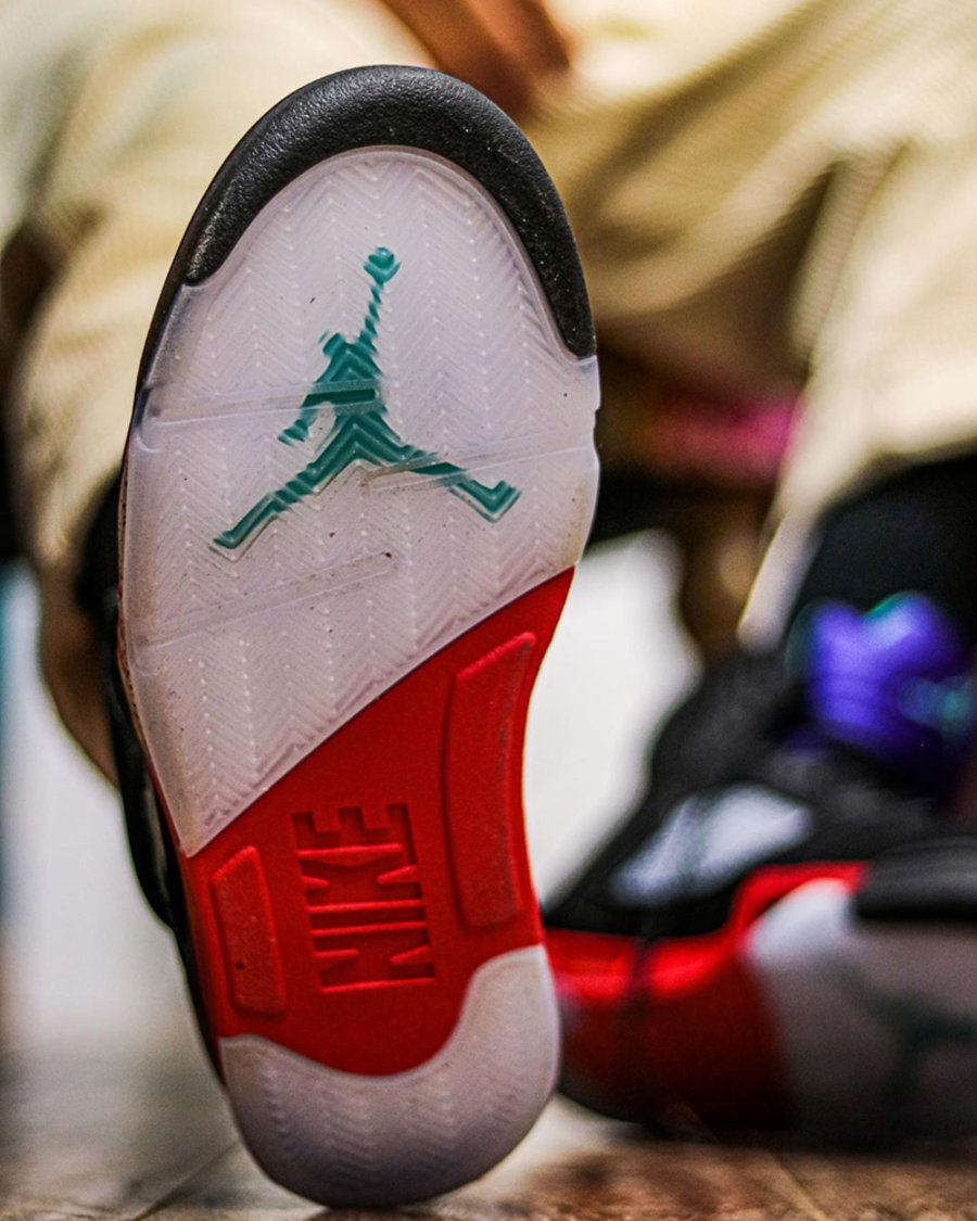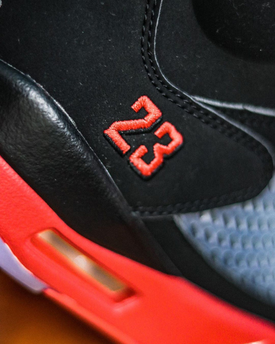 不同于最早曝光的效果图,整双鞋并非采用鸳鸯配色呈现,而只是将 Air Jordan 5 中经典的「黑银」、「白红」和「葡萄」三大经典配色融为一体。