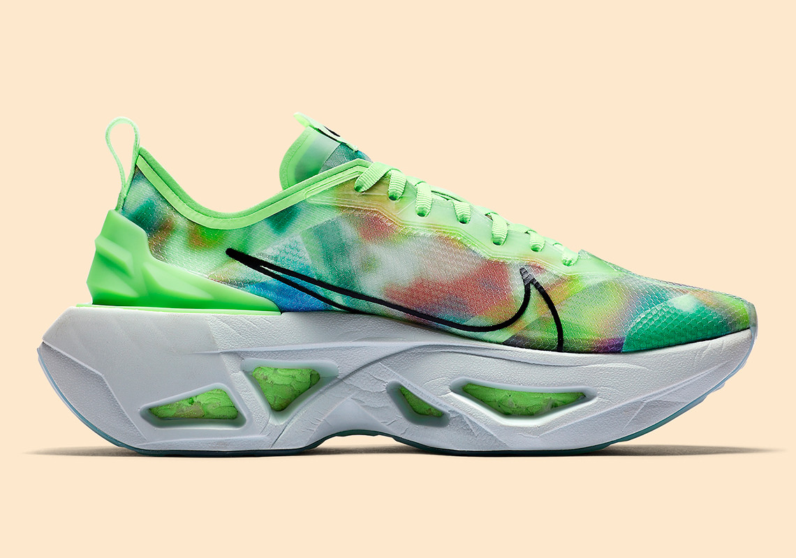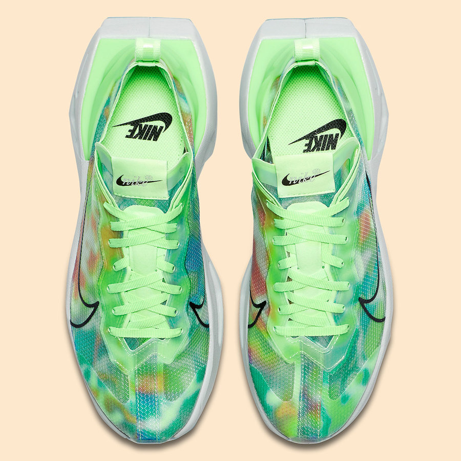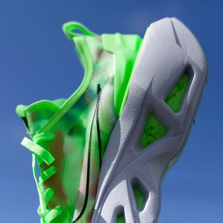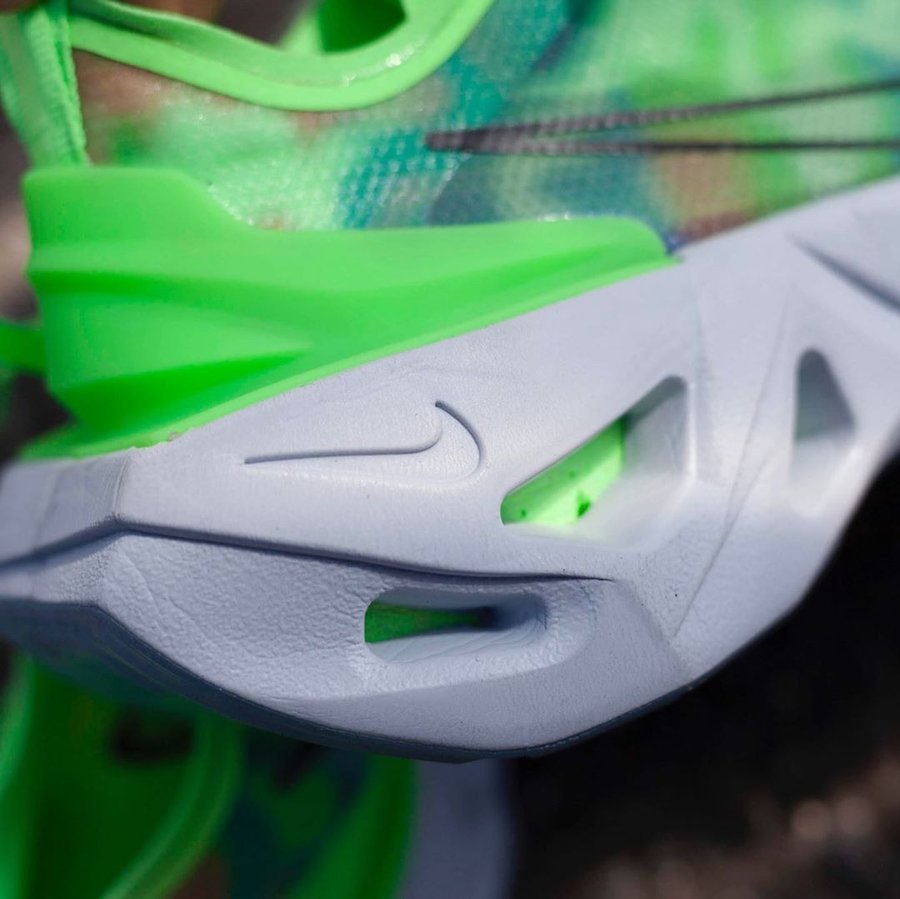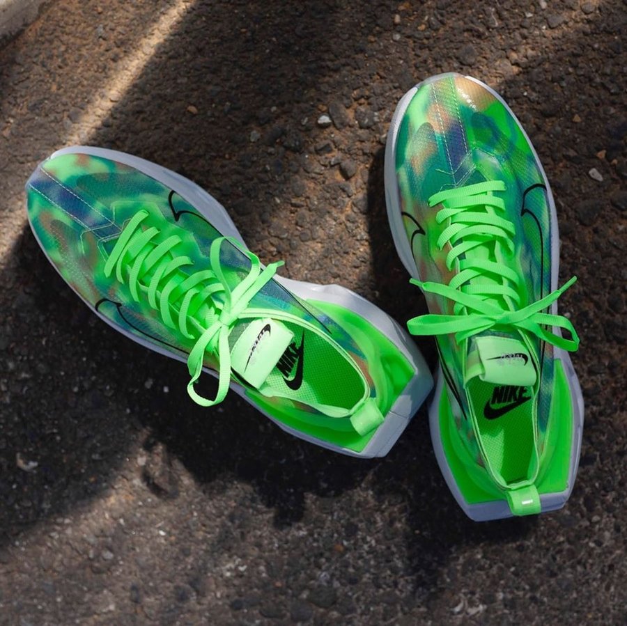 两款配色分别以荧光绿和黑色为主色调,鞋面蝉翼部分均以酷似扎染的彩色装扮,相比传统的半透明设计别有一番韵味。