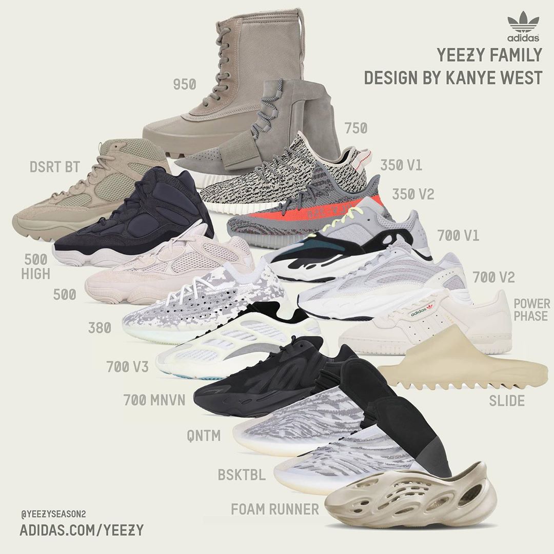 就在今早,知名球鞋爆料账号 @yeezyseason2 用一张图总结了从 2015 年到 2020 年的所有 adidas Yeezy 鞋型。