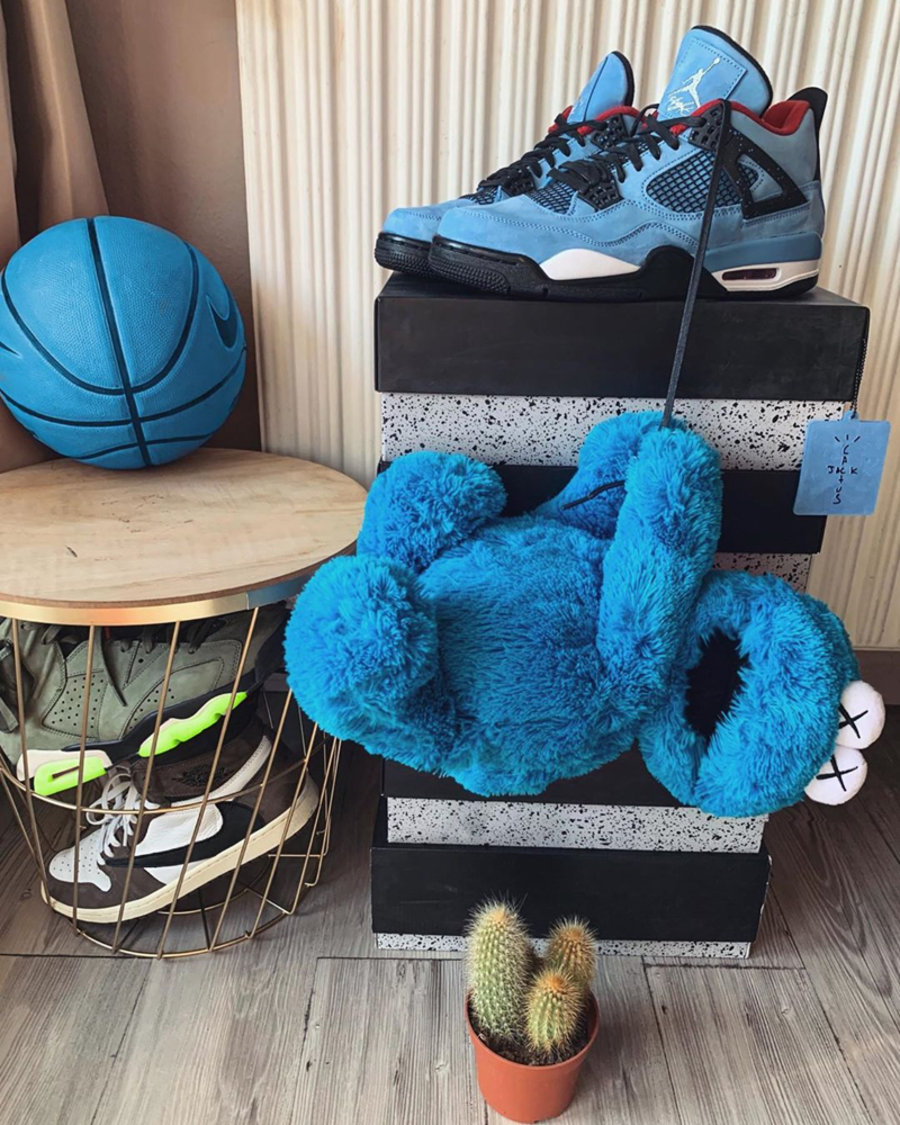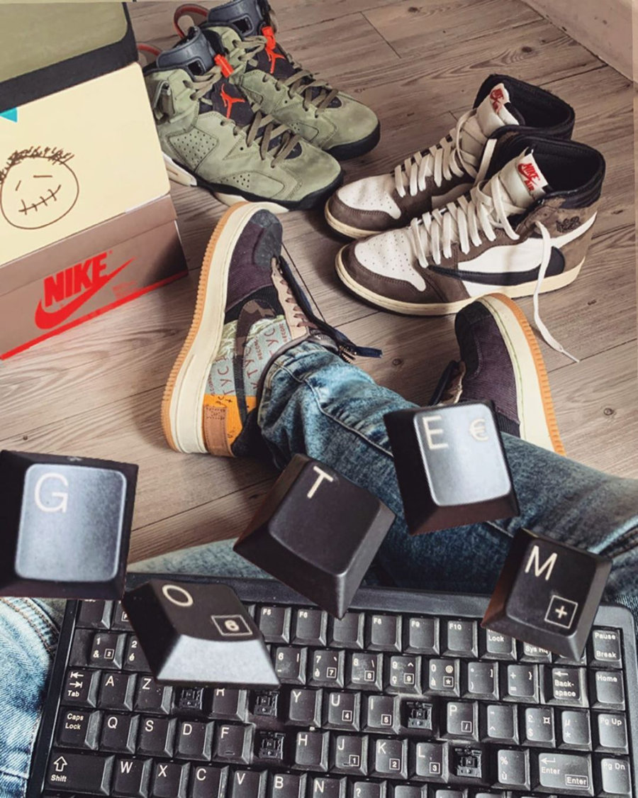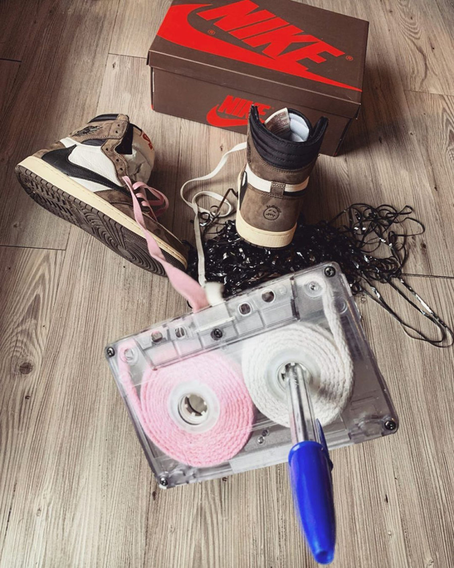 通过 DIY 为 Travis Scott x Air Jordan 1 后跟的鬼脸戴上了口罩,另一边的鬼脸则是举起了 Stay Home Stay Safe 的牌子,用球鞋的方式向大家普及防护知识。