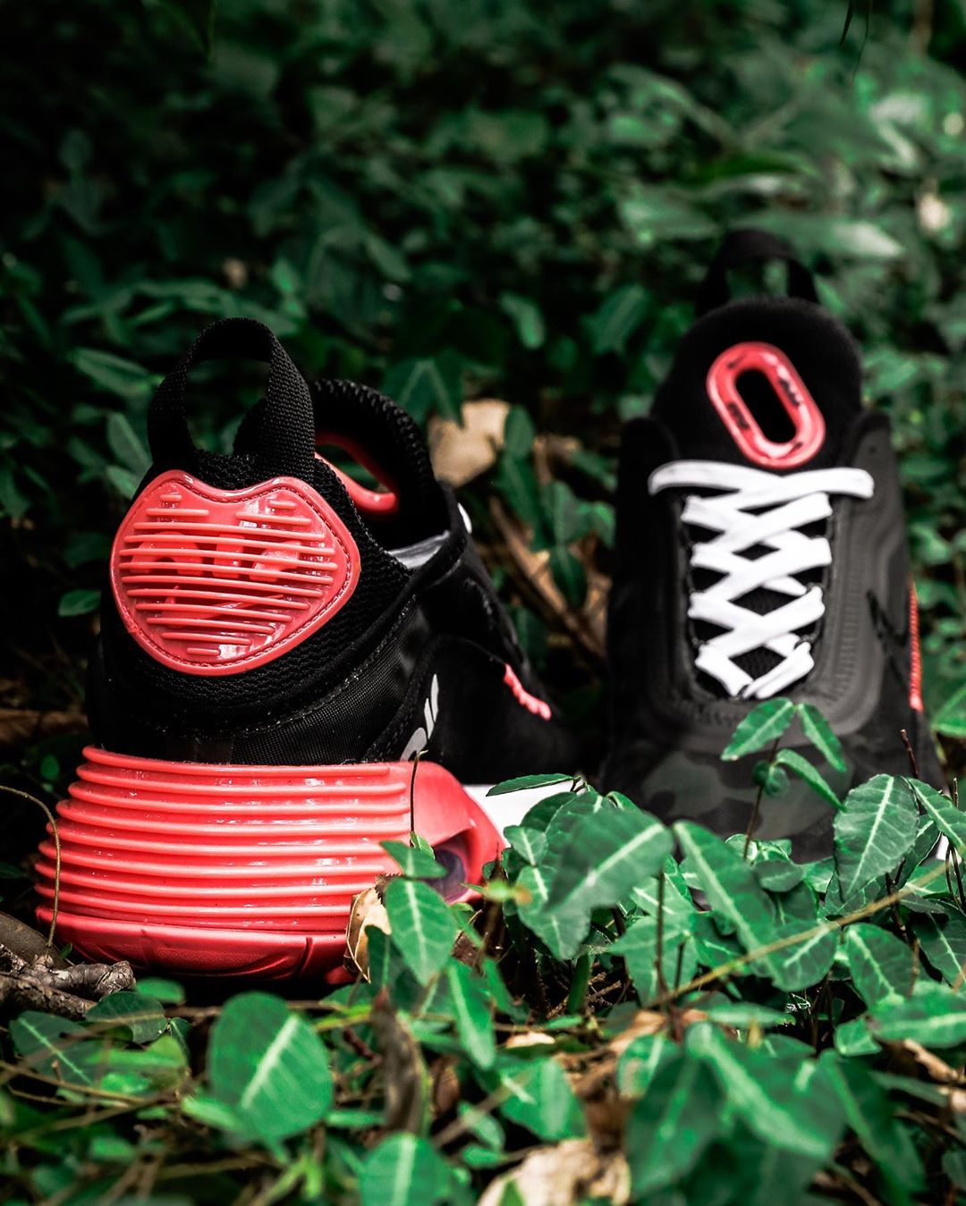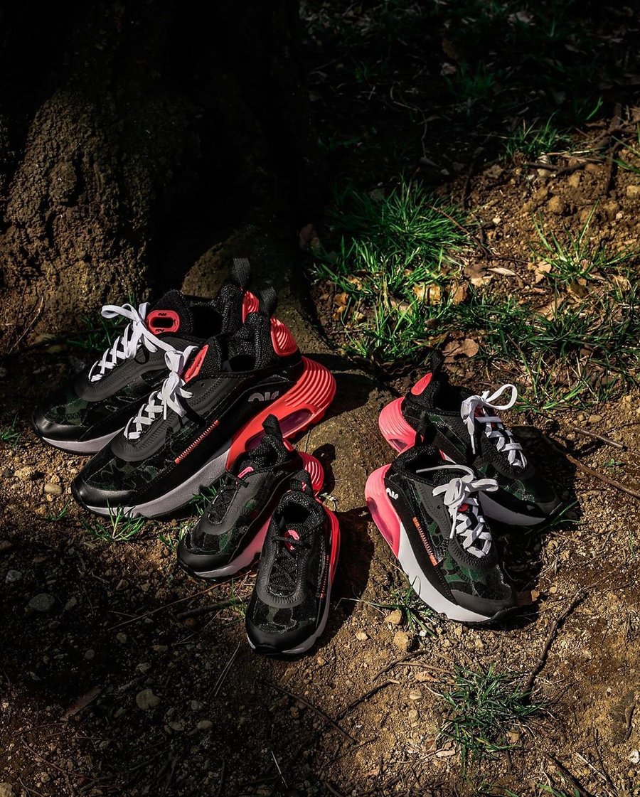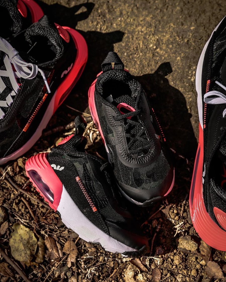 Air Max 2090 在黑色鞋面中隐约透出迷彩元素,细节同样搭配西瓜红色。