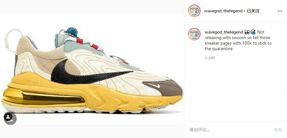 近日,原定于本月发售的普通版 Travis Scott x Air Max 270 React 也更新了发售消息。