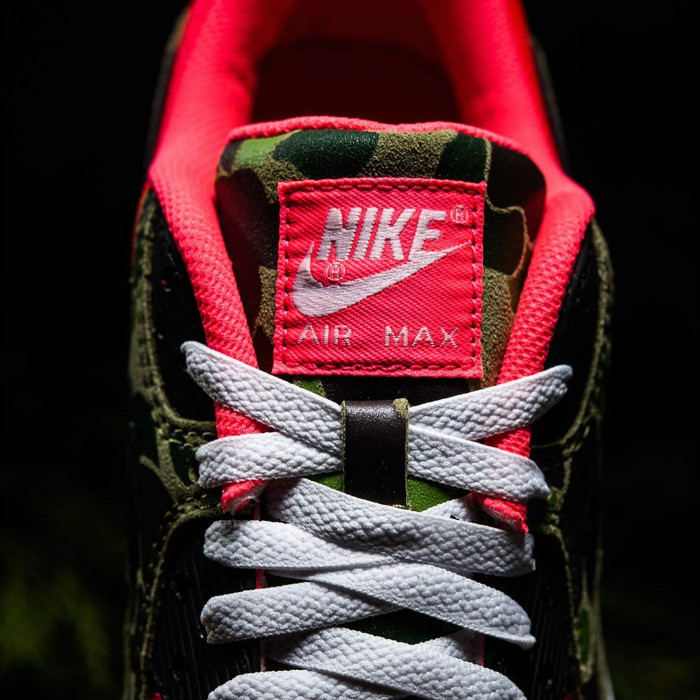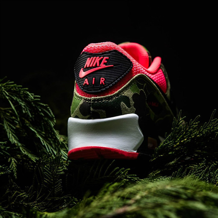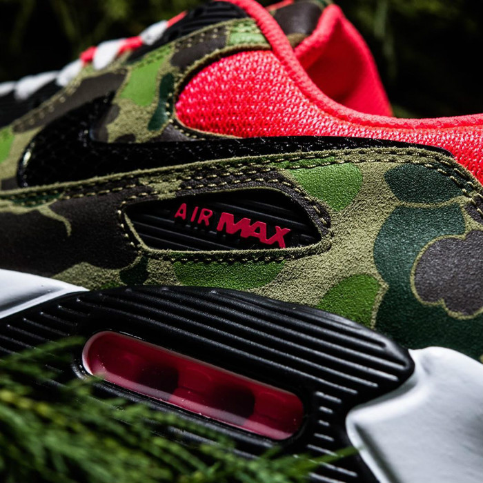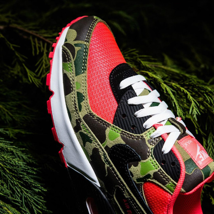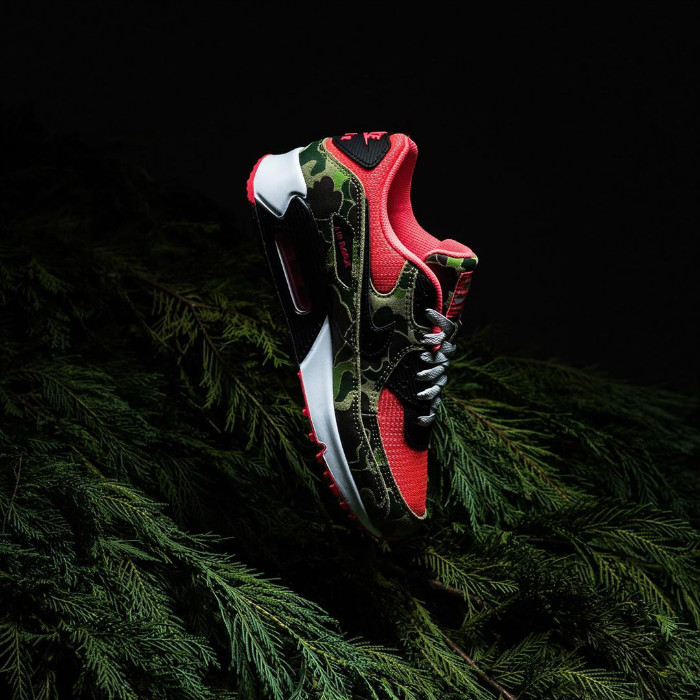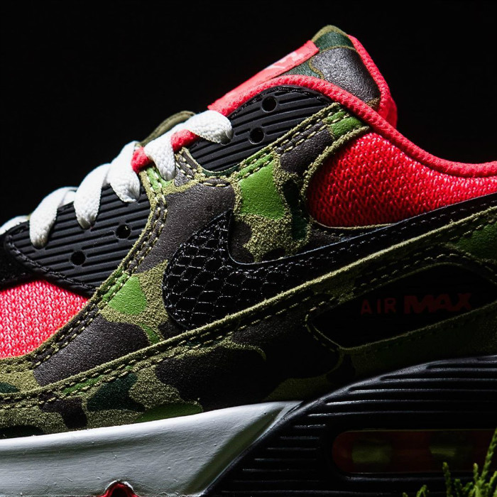 将 2013 年登场的 atmos 合作款 Air Max 90 “Duck Camo” 黑、红细节对调。