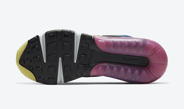 白色、粉色以及荧光黄色构成中底,搭配黑色外底完善整双鞋的设计。
