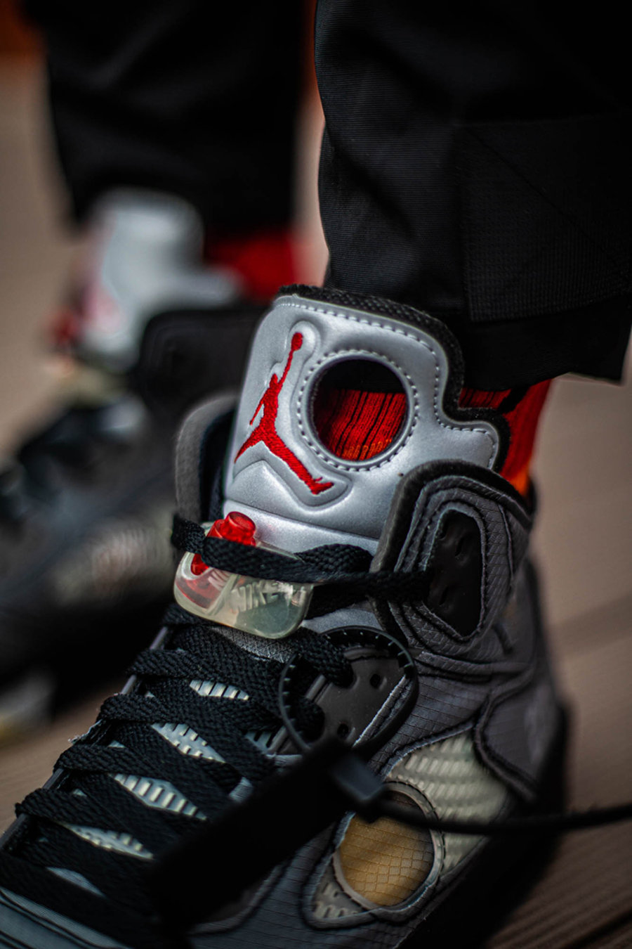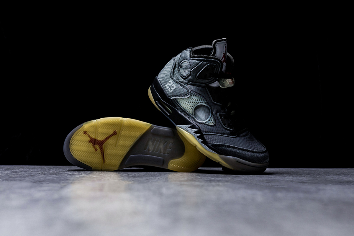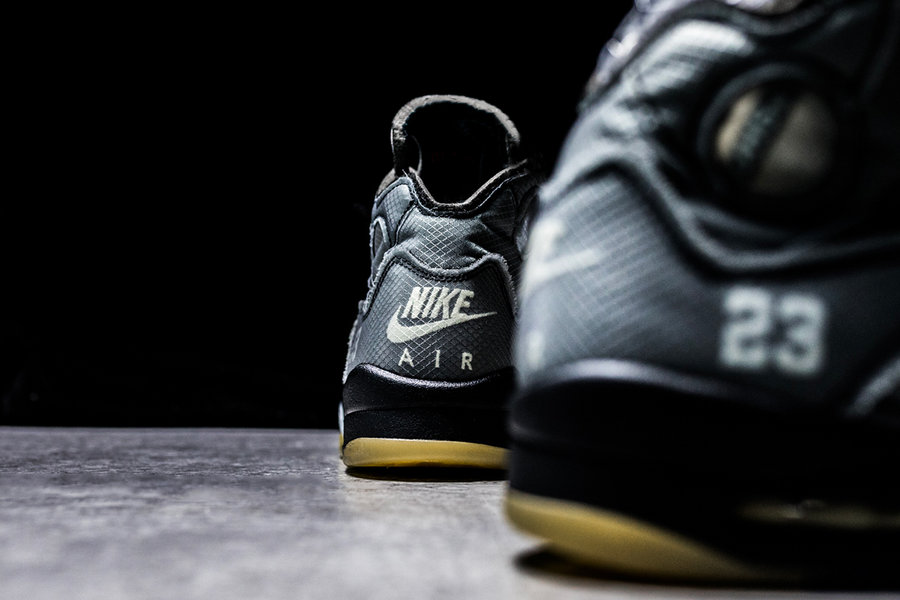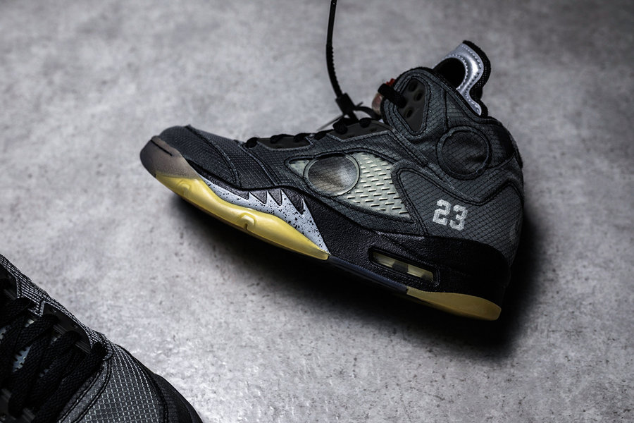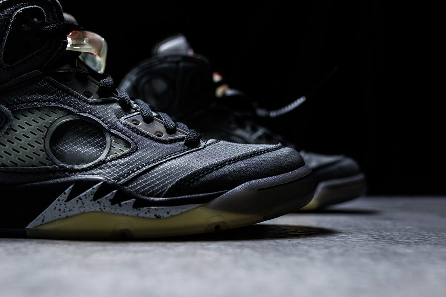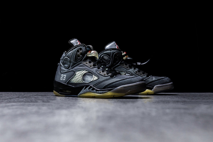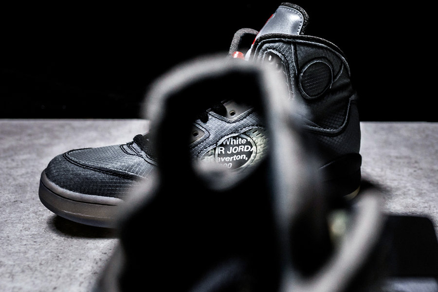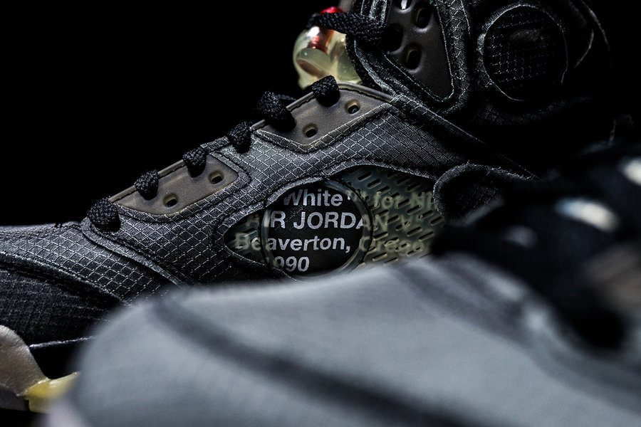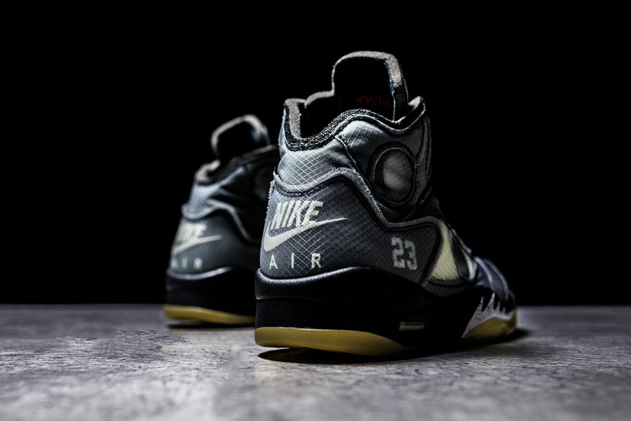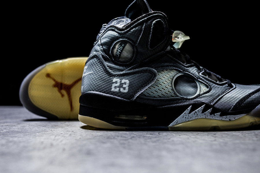 这双联名的配色方案,源自经典的 Air Jordan 5 “Black Metallic”,是 Virgil 儿时说服父母买的第一款 Air Jordan 5。