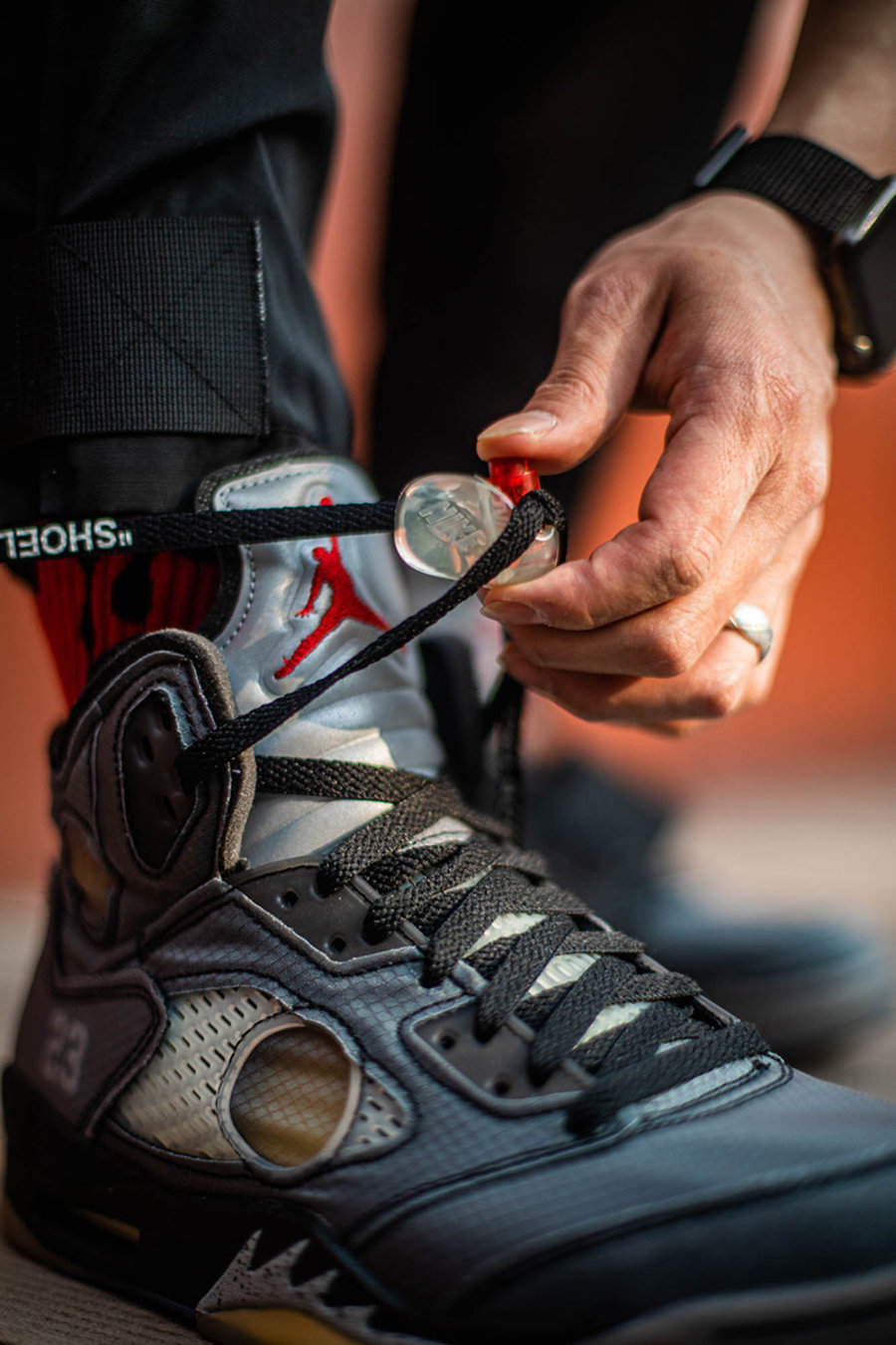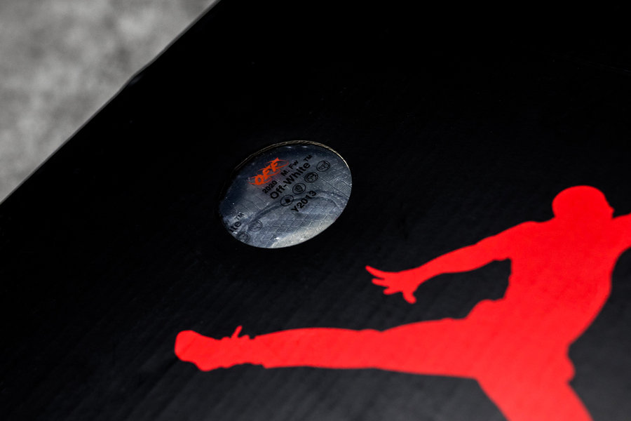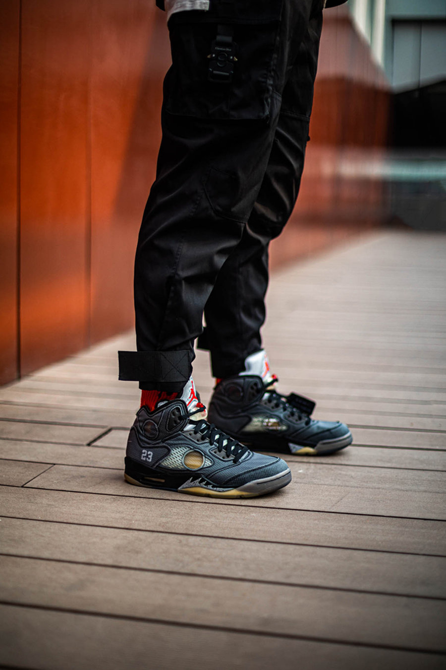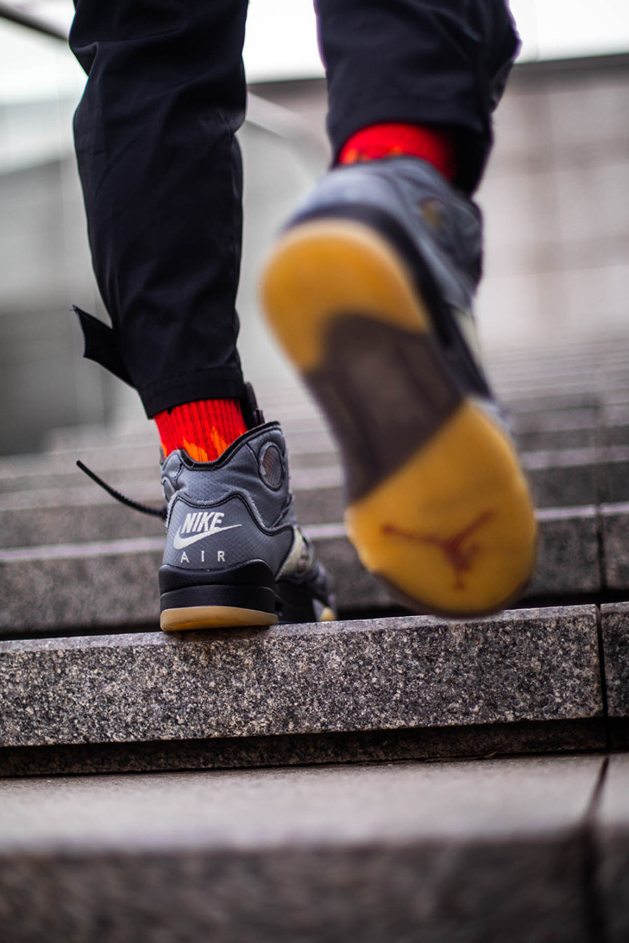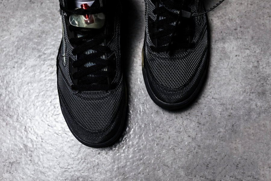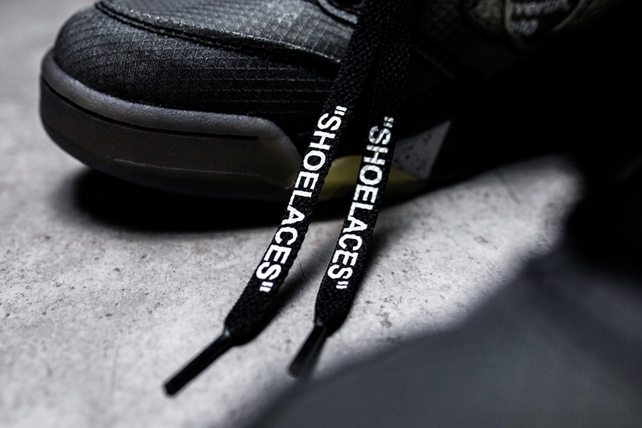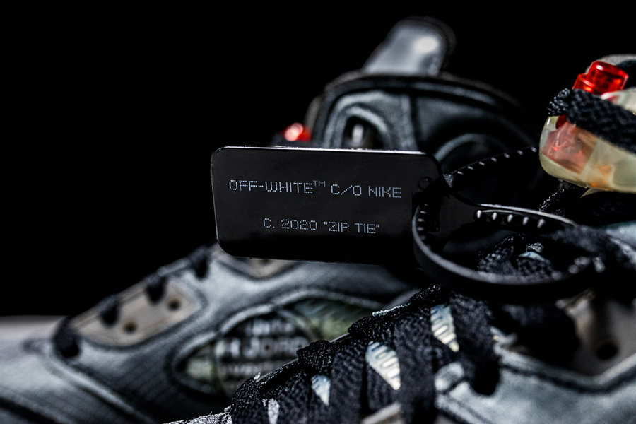 这双联名的配色方案,源自经典的 Air Jordan 5 “Black Metallic”,是 Virgil 儿时说服父母买的第一款 Air Jordan 5。