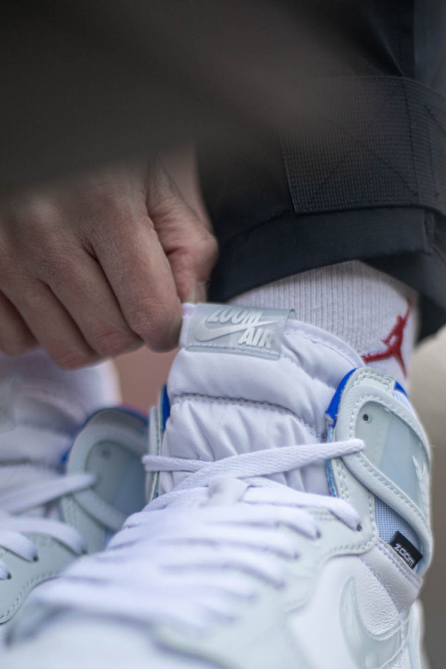 这双的鞋后跟便采用了元年的 Nike Swoosh Logo,藏在蝉翼下的白色刺绣,尽显顶级联名的细节把控力。