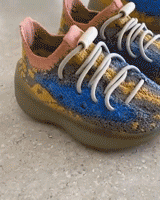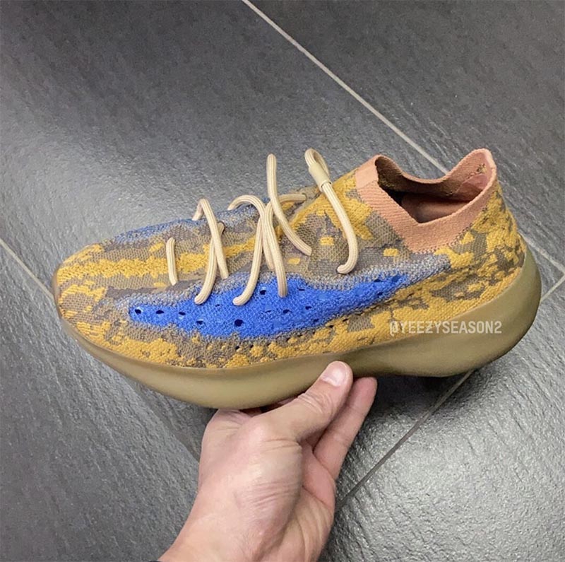 鞋身以深棕搭配姜黄构成独特的迷彩纹理,在延续侃爷酷爱的大地色之余,更罕见在鞋身透明镂空位置加入宝蓝色调!