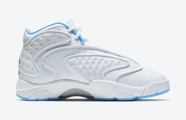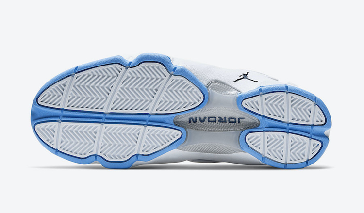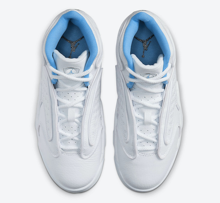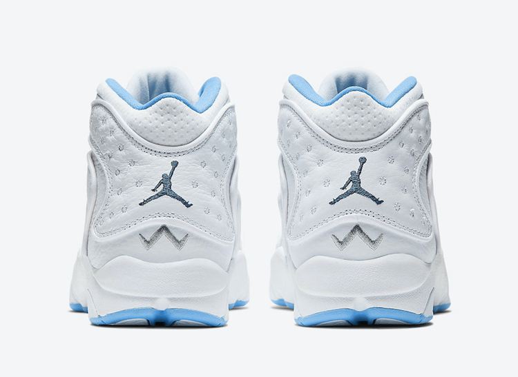 中底点缀深蓝色 Jumpman Logo,后跟刺绣设计的飞人 Logo 同样颇具看点。