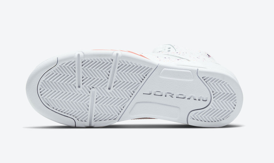 整双鞋都以白色为基础,整个白色鞋面都加入紫色、粉色和橙色泼墨点缀,中底红色鲨鱼齿装饰与鞋舌的飞人 Logo 相呼应,淡紫色内衬再次提升层次感。