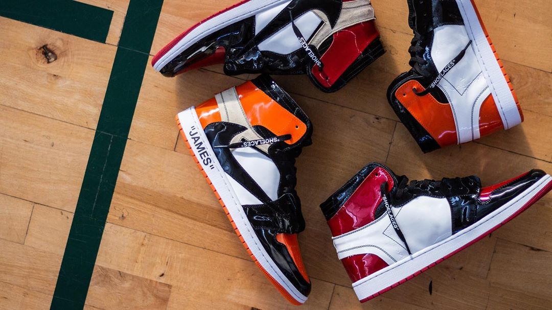 近日有媒体拍到勒布朗·詹姆斯的儿子小勒布朗·詹姆斯上脚了一双定制版本的反钩 Travis Scott x OFF-WHITE x Air Jordan 1。