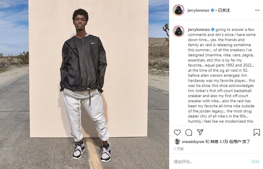 与此同时,Jerry 还宣布,将在今年夏天发售此前列为亲友限定版本的 Nike Air Fear of God Raid “Friends & Family” 配色。