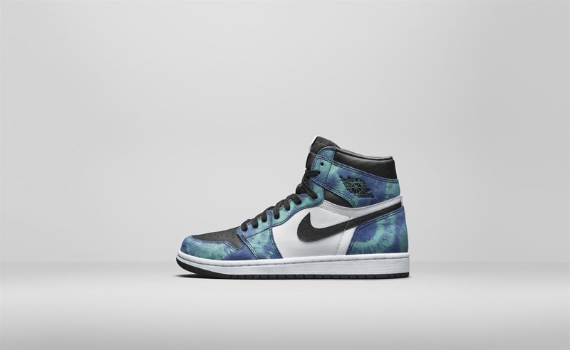 这双为女生打造的 Air Jordan 1,采用蓝色与绿色的扎染风格呈现鞋身框架,也是 Jordan Brand 首次尝试季节性扎染图案。