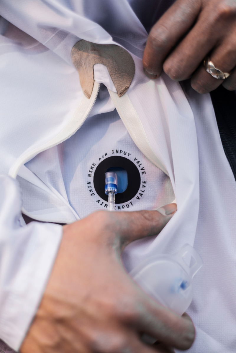 最大特色在于内衬暗藏蓝色气囊,通过手动调节可使其膨胀,为身体与外界瞬间变出一个额外保暖层,进而起到一定的保温效果。