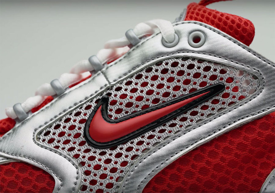 Nike Air Zoom Spiridon Caged 2 将在 4 月 14 日发售 Varsity Red 和 Silver Metallic 两款配色,采用了不同密度的穿孔织物面料,鞋型轮廓和这一份视觉质感,都颇具 2000 年的经典感受。