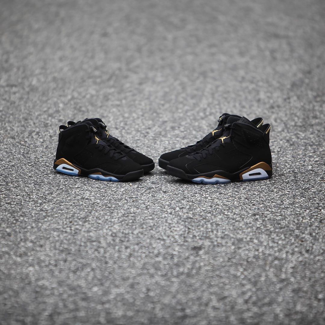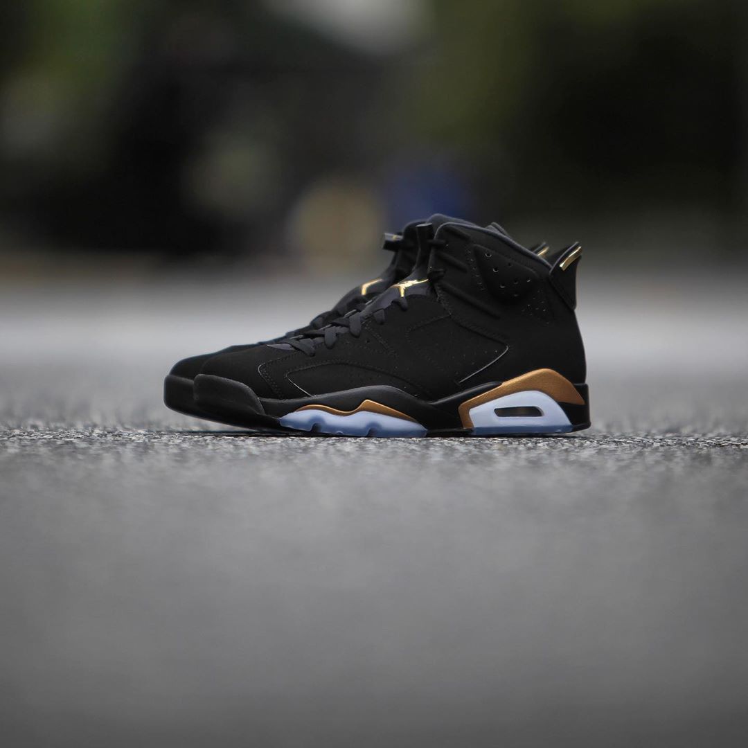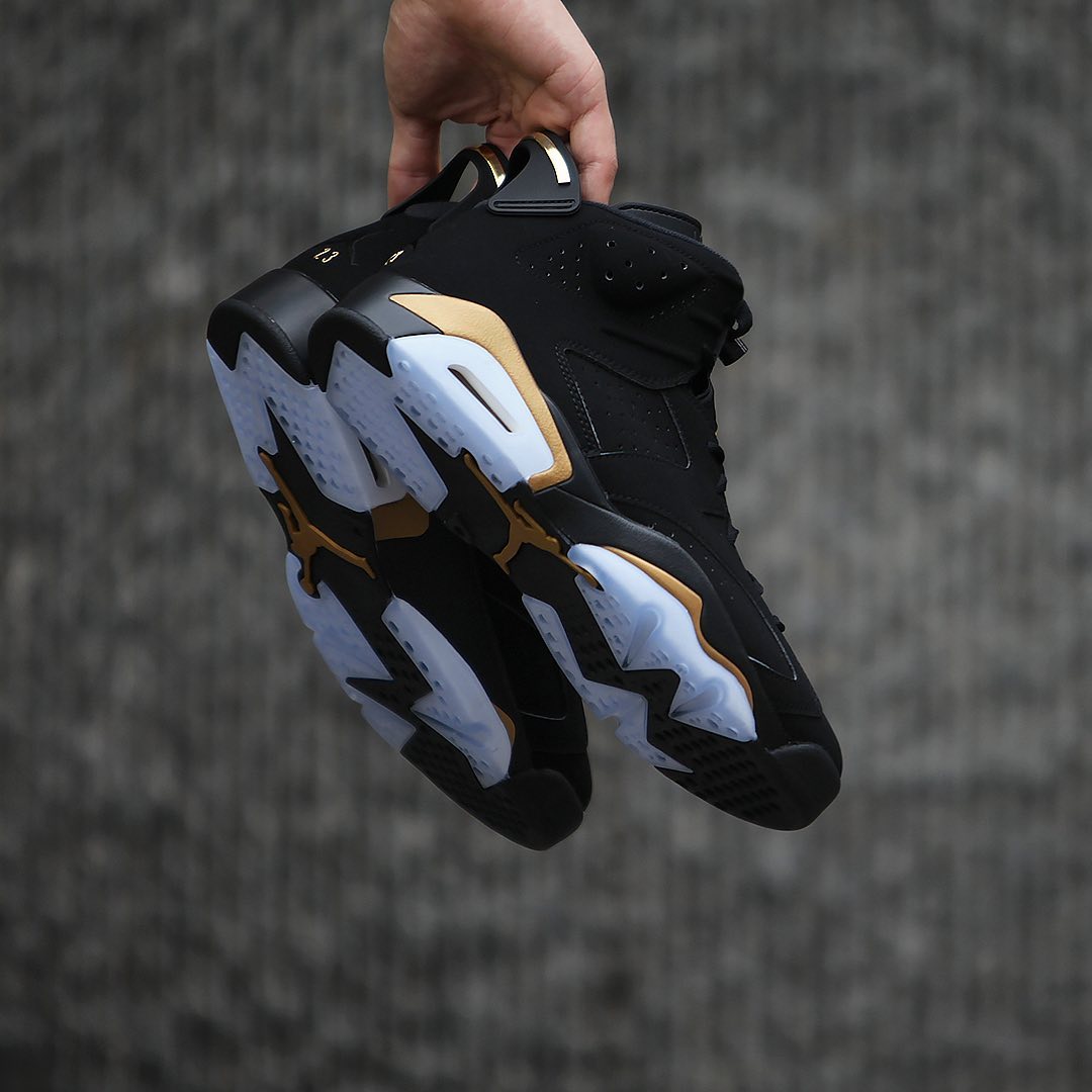 质感十足的黑色牛巴革鞋面,加上金色细节的华丽装饰,Air Jordan 6 “DMP” 在今年的发售依然引人瞩目。