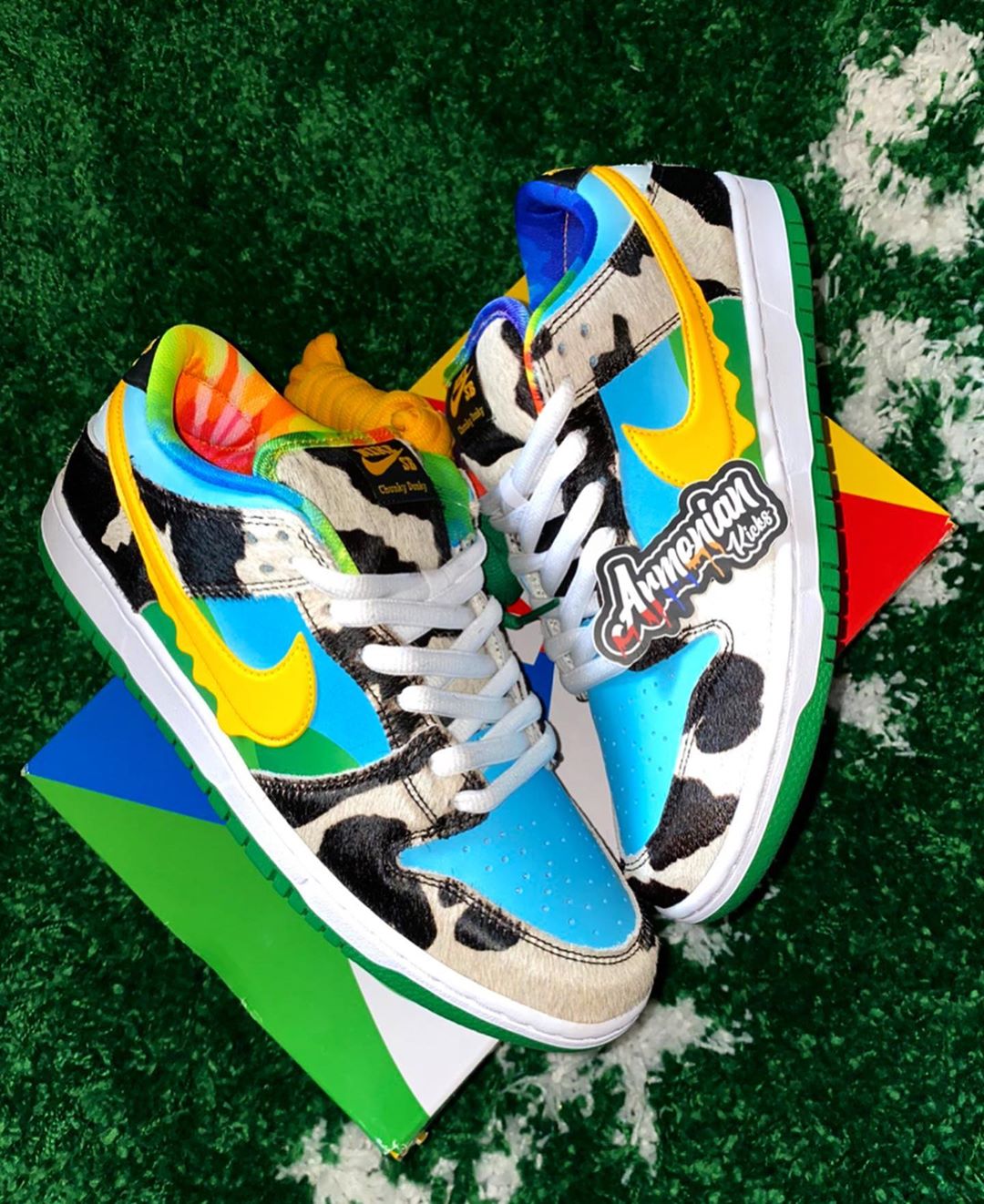 鞋身设计灵感源自联名冰淇淋品牌 Ben & Jerry's 的包装设计,融合蓝天白云、青草绿地以及奶牛、冰淇淋糖果等元素于鞋身。