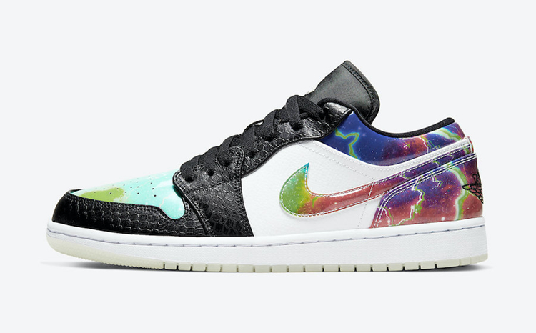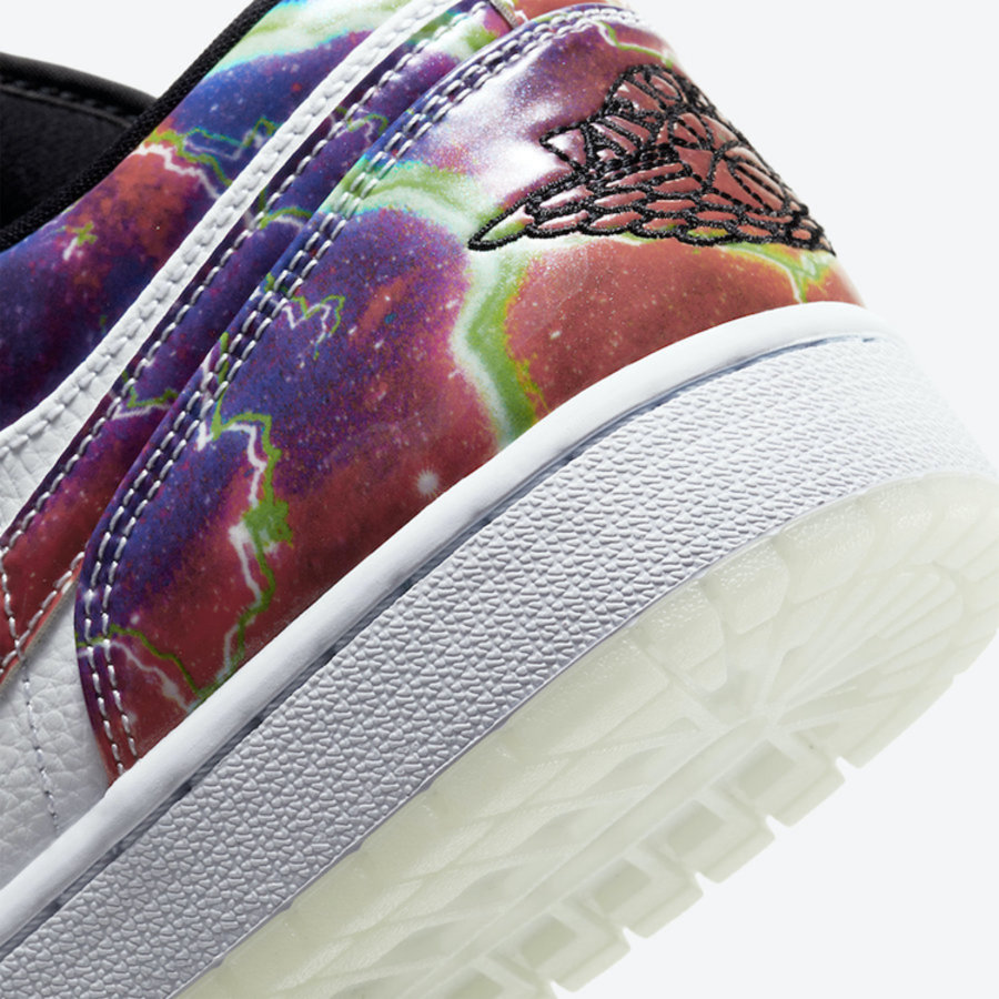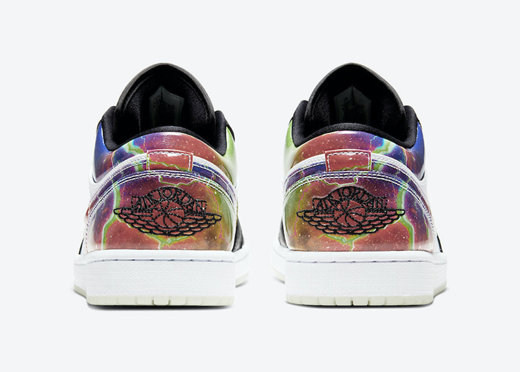 鞋身中部采用白色过渡,最大亮点在于侧身 Nike Swoosh Logo 以及后跟采用银河星空装扮,蓝色、粉色、紫色、绿色以及白色等多种色调融合,呈现出切实的星空效果。