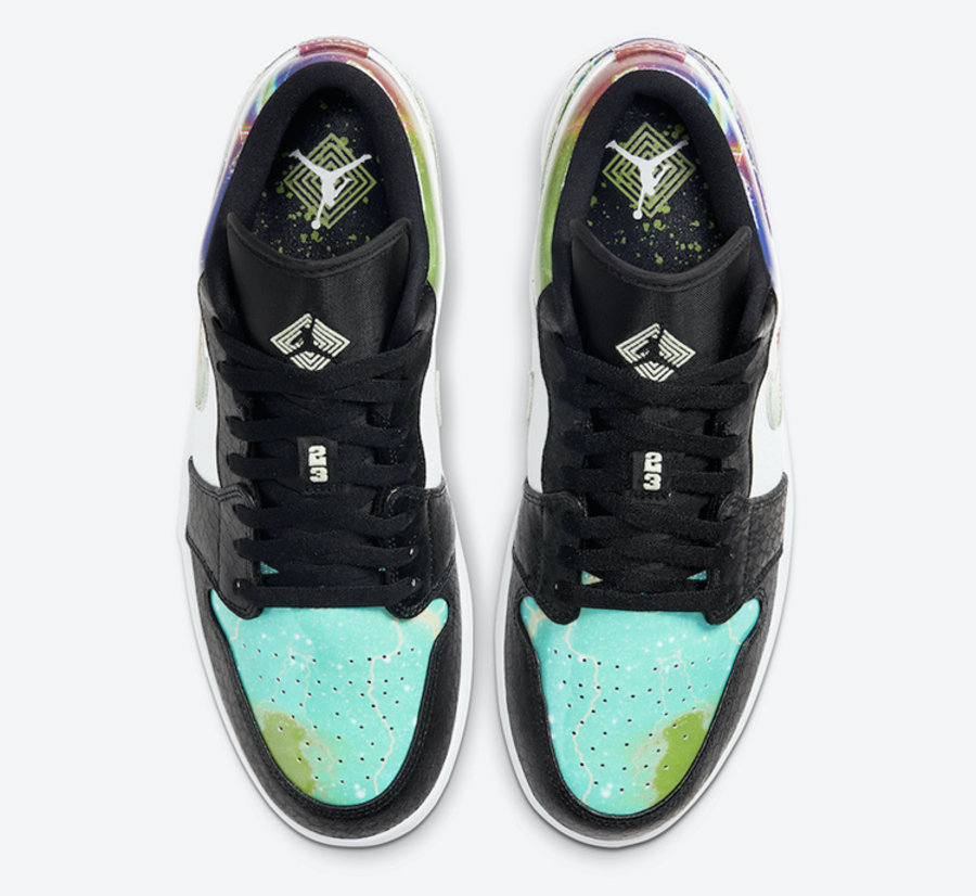 黑色鞋舌点缀白色 23 标签以及 Jumpman Logo,同时鞋垫上除了 Jumpman Logo 之外还有绿色喷溅效果涂鸦。