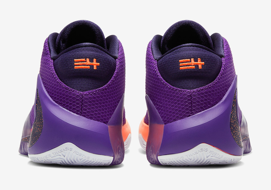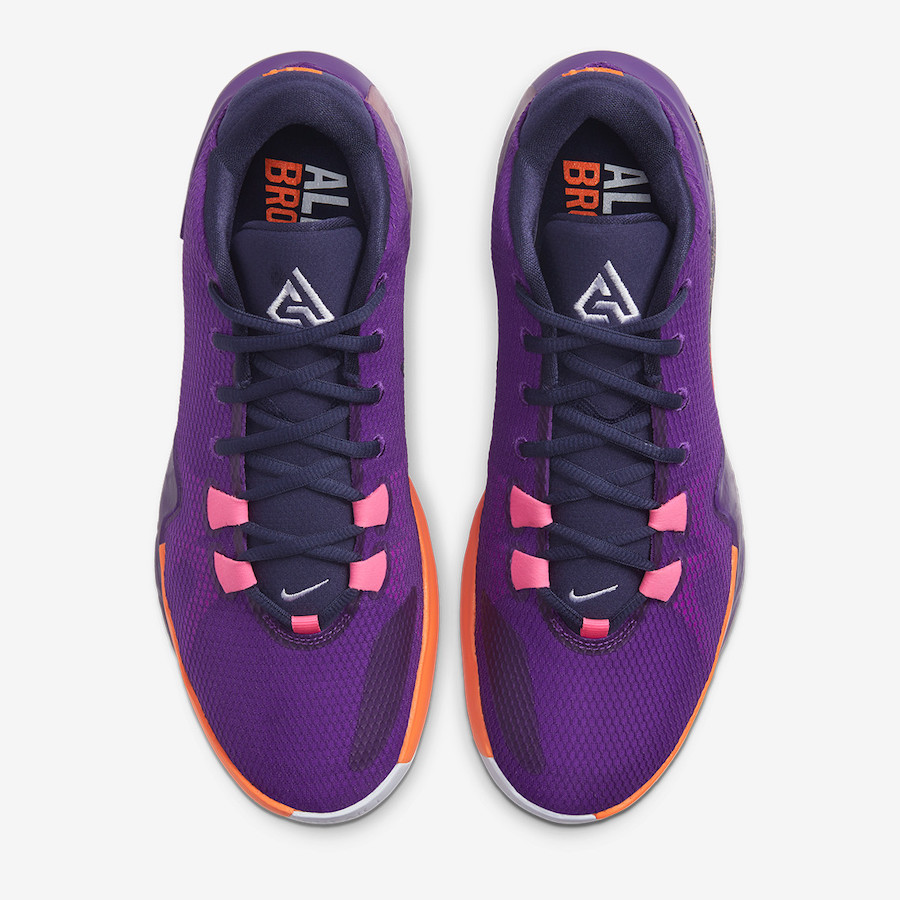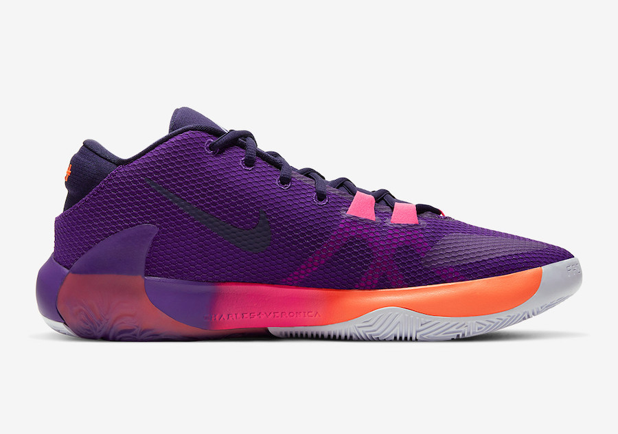 这款配色依然以字母哥的兄弟们为灵感,采用紫色 + 粉色鞋面搭配橙、粉、紫渐变中底,整体配色颇为风骚。