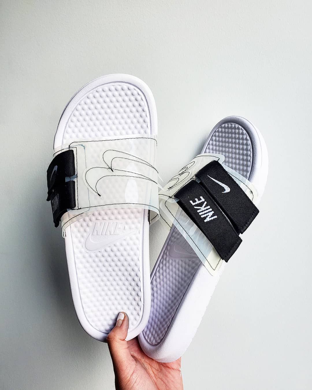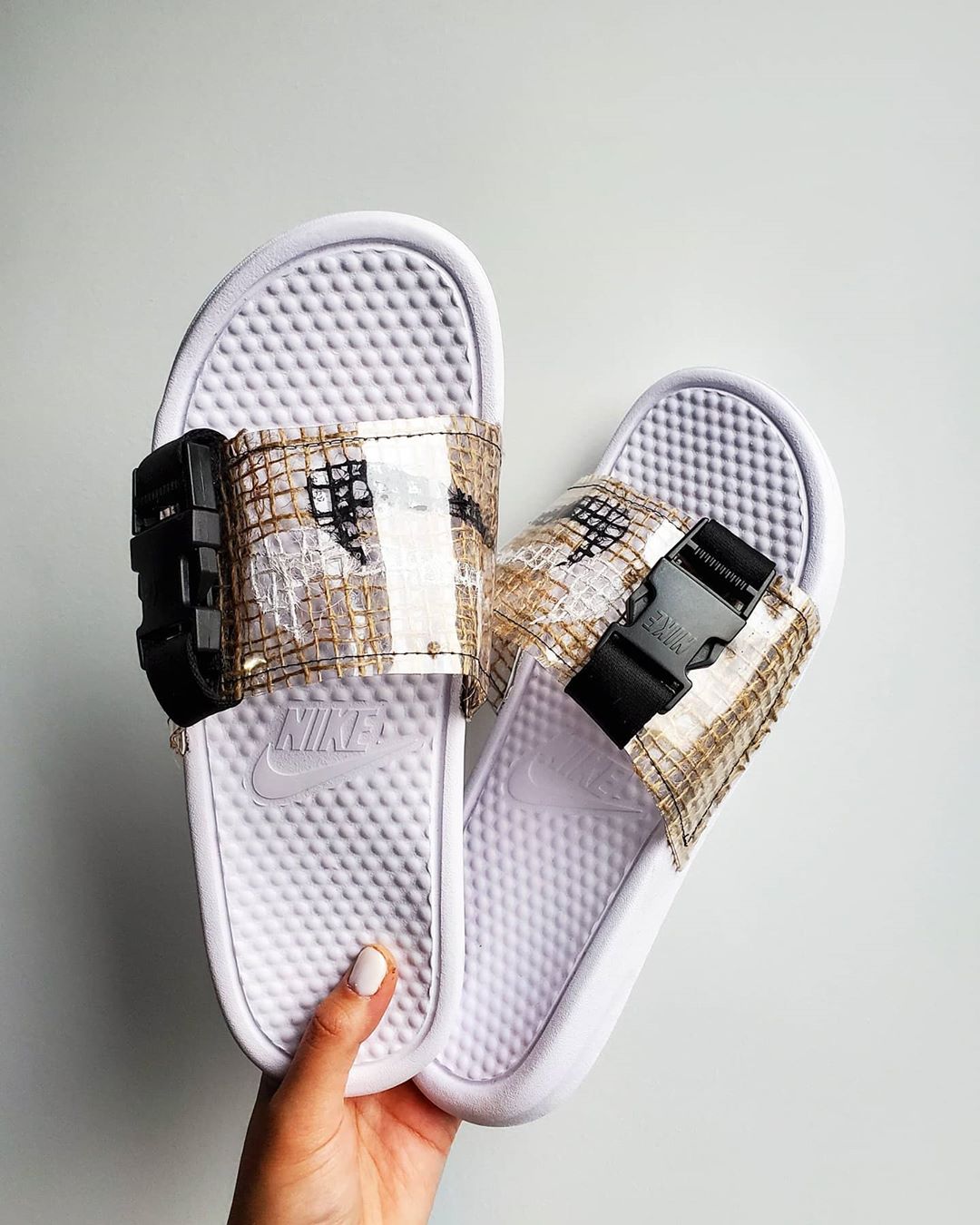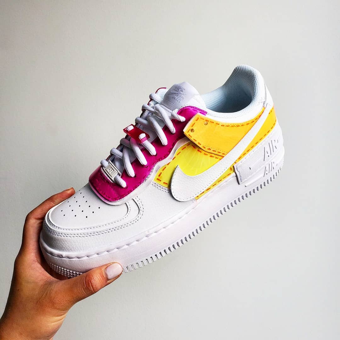 比如改造白色的 Air Force 1,在鞋带孔周围和侧身加入透明贴片;
