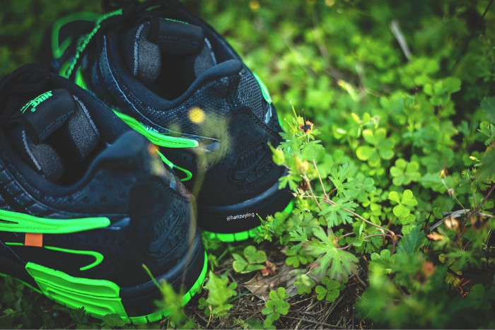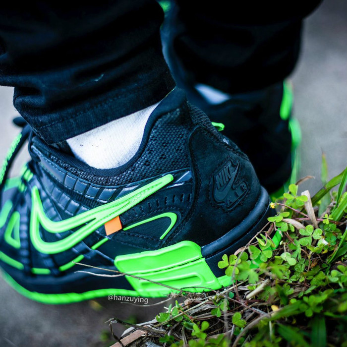 整体采用黑色翻毛皮革搭配绿色橡胶材质撞色呈现,无论是色调还是质感,都拥有着鲜明的反差效果,视觉辨识度极高。