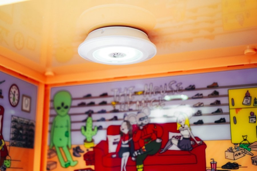 酷似客厅顶灯的灯光设计,不仅营造氛围,也为盒内球鞋带来更好的展示效果。