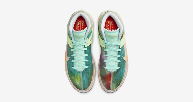 整双鞋采用湖水蓝色作为主调,独特的渐变效果在细节处融合浅绿色与红色,带来鲜明的对比效果。