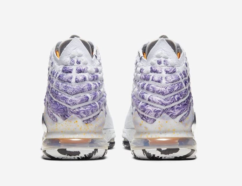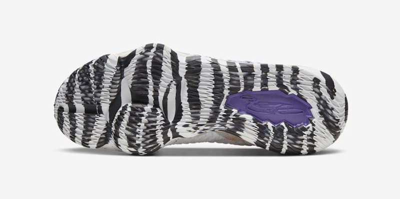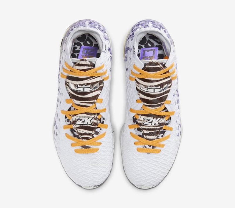 采用了湖人队的白紫金配色,搭配斑马纹的鞋舌和外底。