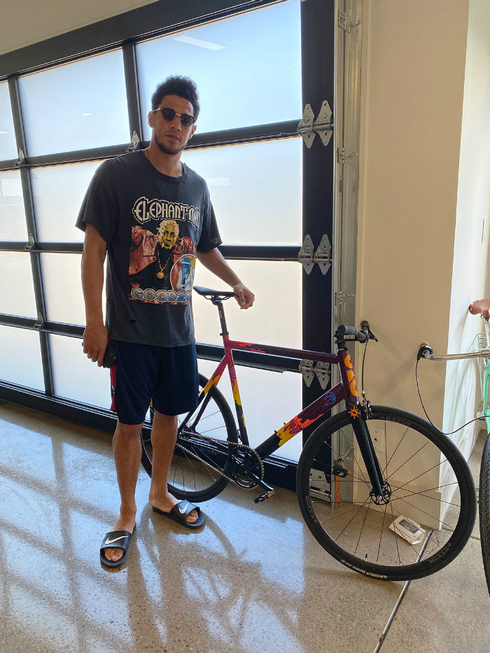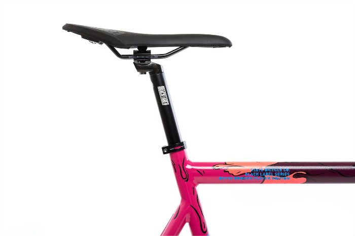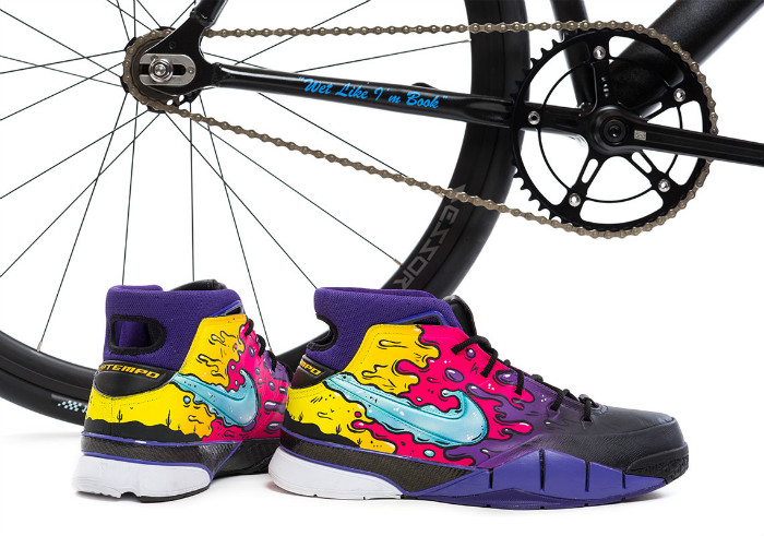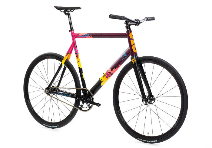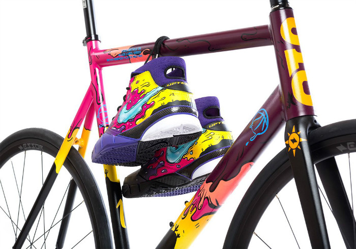 除此之外,还特别涂装了一辆 State Bicycle.co Black Label 6061 死飞自行车与之搭配,同样的设计元素呈现于车架之上,并在细节点缀太阳、篮球等元素,令人相当羡慕!
