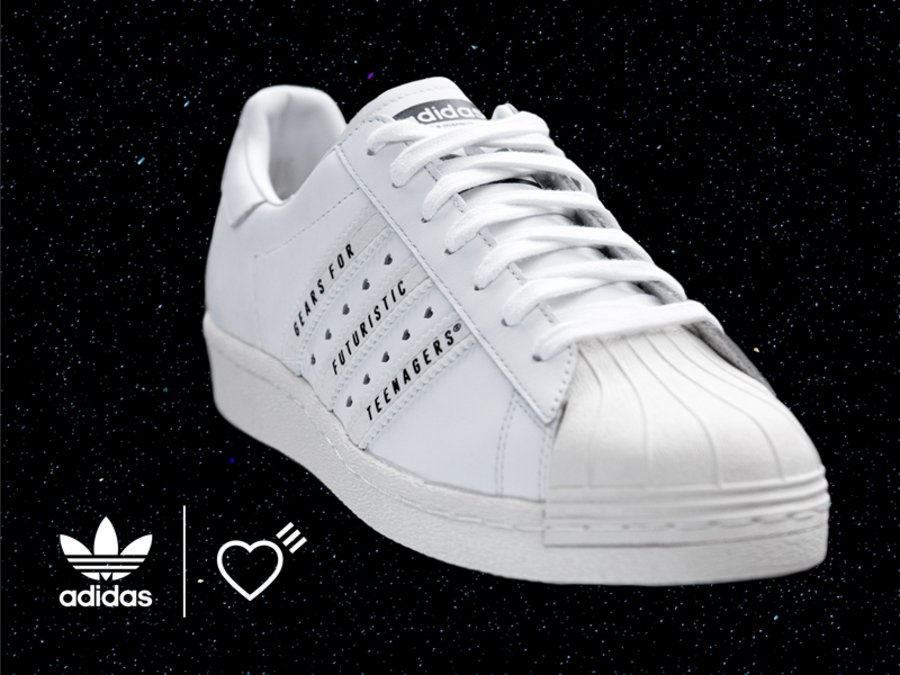 三双鞋以 adidas Superstar 经典的黑白造型呈现,在三道杠位置以 Human Made Logo 及标语装饰,并以镂空桃心点缀在鞋身多处,整体设计兼具双方的特色风格。