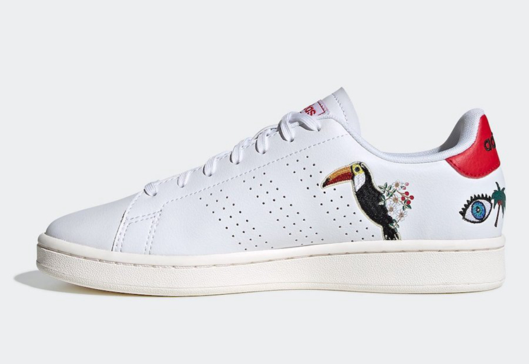 整双鞋采用 adidas Advantage 鞋款为设计蓝本,一袭纯白装扮带来极为清爽的视觉效果。