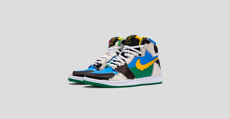 整双鞋的设计灵感源自于冰淇淋品牌 Ben & Jerry's,将冰淇淋的包装设计:蓝天白云、青青草原以及奶牛、冰淇淋糖果等元素全都融于一身,带来十分抢眼的视觉效果。