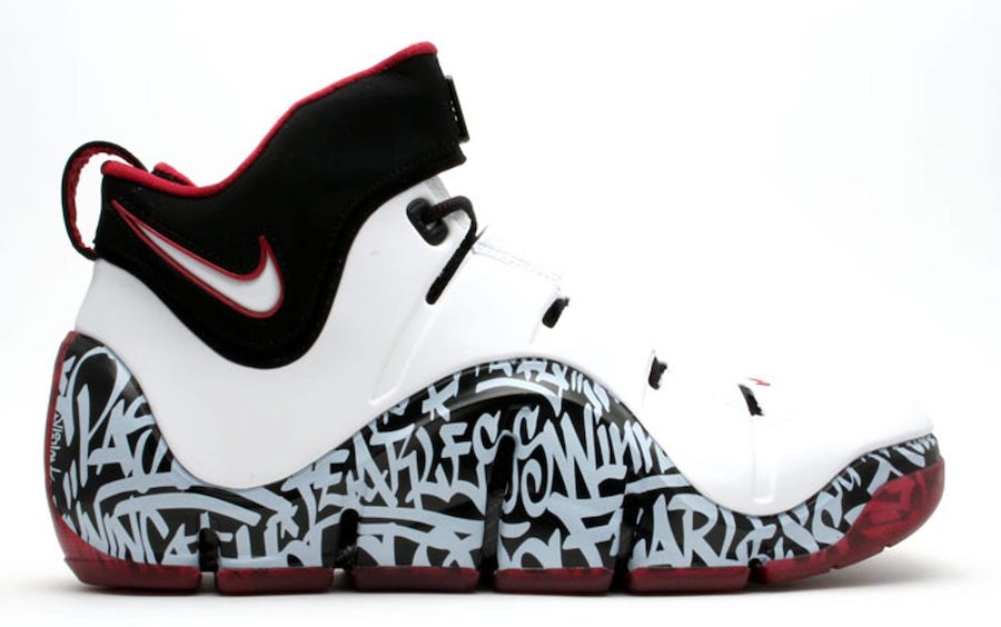 可以看出这双 LeBron 17 “Graffiti” 的配色灵感就是来自极为稀有的天价鞋 LeBron 4 “Graffiti”,整体黑白红的搭配与鞋面醒目的黑白涂鸦都如出一辙。